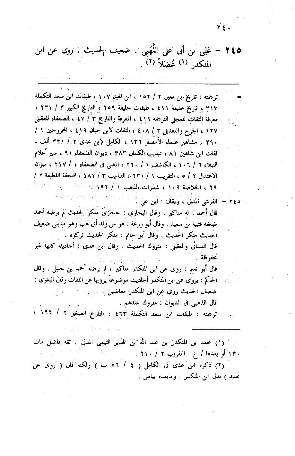 240 - علي بن أبي علي اللهبي ضعيف الحديث روى عن ابن المنكدر عضلا