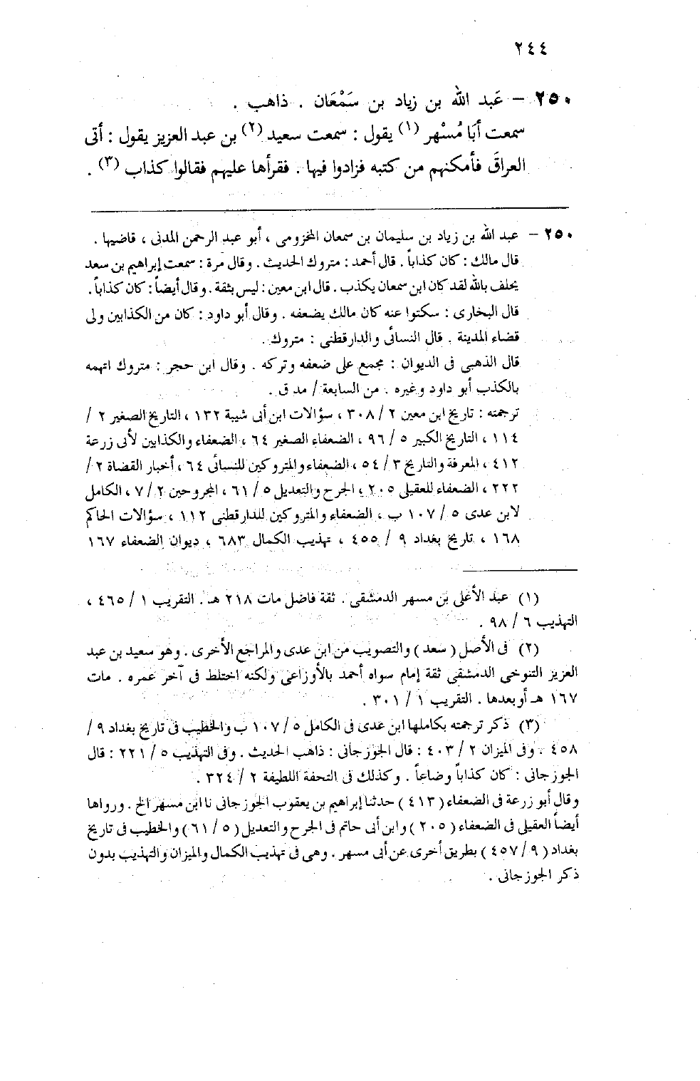 245 - عبد الله بن زياد بن سمعان ذاهب سمعت أبا مسهر يقول سمعت سعد بن عبد العزيز يقول أتى العراق فأمكنهم من كتبه فزادوا فيها فقرأها عليهم فقالوا كذاب
