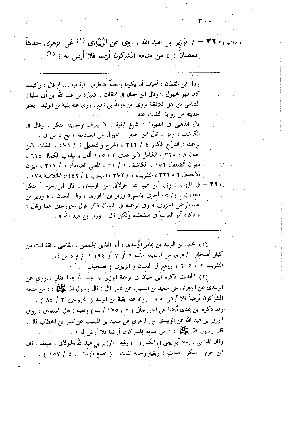 315 - الوزير بن عبد الله روى عن الزبيدي عن الزهري حديثا معضلا من منحه المشركون أرضا فلا أرض له