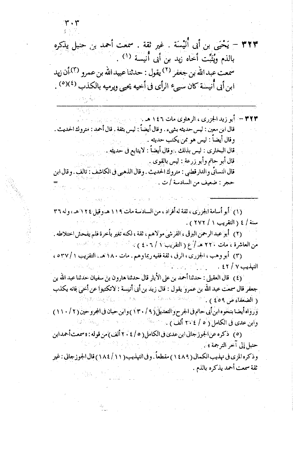 318 - يحيى بن أبي أنيسة غير ثقة سمعت ابن حنبل يذكره بالذم ويثبت أخاه زيد بن أبي أنيسة سمعت عبد الله بن جعفر يقول حدثنا عبيد الله بن عمرو أن زيد بن أبي أنيسة كان سيء الرأي في أخيه يحيى ويرميه بالكذب