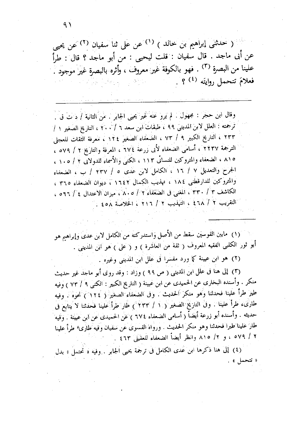 عن علي حدثنا سفيان عن يحيى الجابر عن أبي ماجد قال سفيان قلت ليحيى من أبو ماجد قال طرأ علينا من البصرة فهو بالكوفة غير معروف وأثره بالبصرة غير موجود فعلام تتحمل روايته