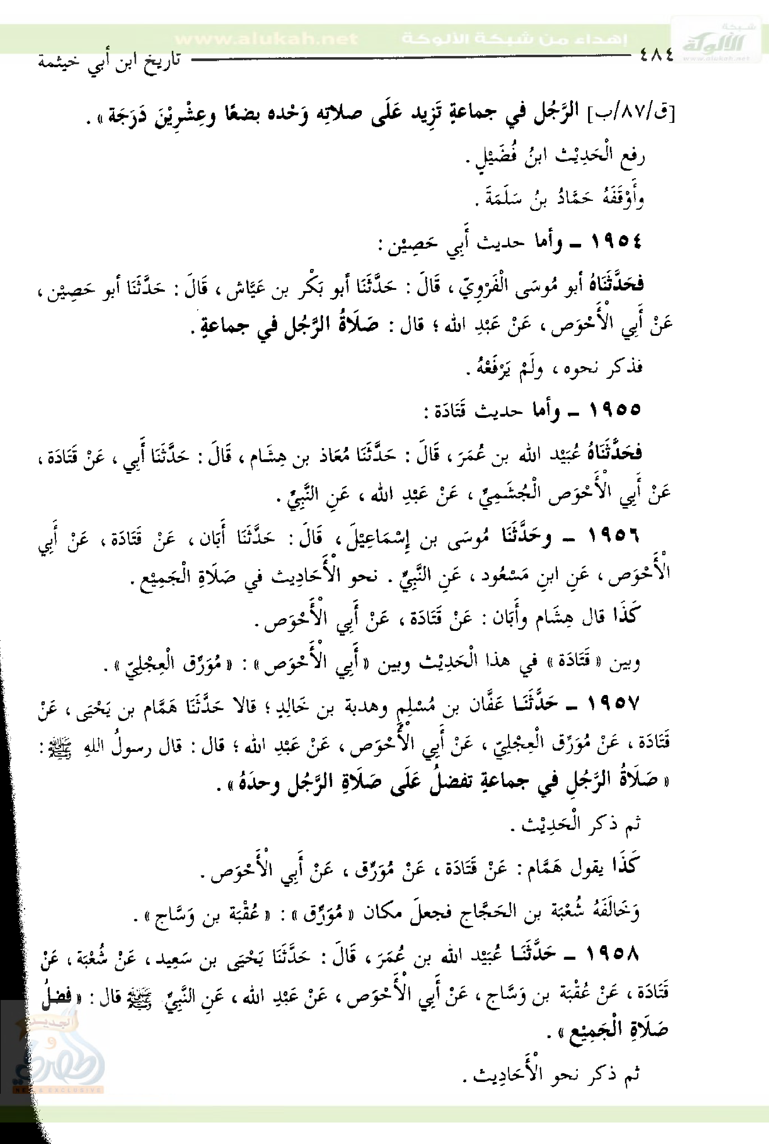 ١٩٥٧- حَدَّثَنَا عَفَّان بْنُ مُسْلِمٍ وَهُدْبَةُ بْنُ خَالِدٍ، قَالا حَدَّثَنَا هَمَّام بْنُ يَحْيَى، عَنْ قَتَادَة، عَنْ مُوَرِّق الْعِجْلِيّ، عَنْ أَبِي الأَحْوَص، عَنْ عَبْدِ اللَّهِ؛ قَالَ: قَالَ رسولُ اللهِ صَلَّى اللهُ عليه وسلم: صَلَاةُ الرَّجُلِ فِي جماعةٍ تفضلُ عَلَى صَلَاةِ الرَّجُل وحدَهُ"، ثُمَّ ذَكَرَ الْحَدِيْث، كَذَا يَقُولُ هَمَّام: عَنْ قَتَادَة، عَنْ مُوَرِّق، عَنْ أَبِي الأَحْوَص.