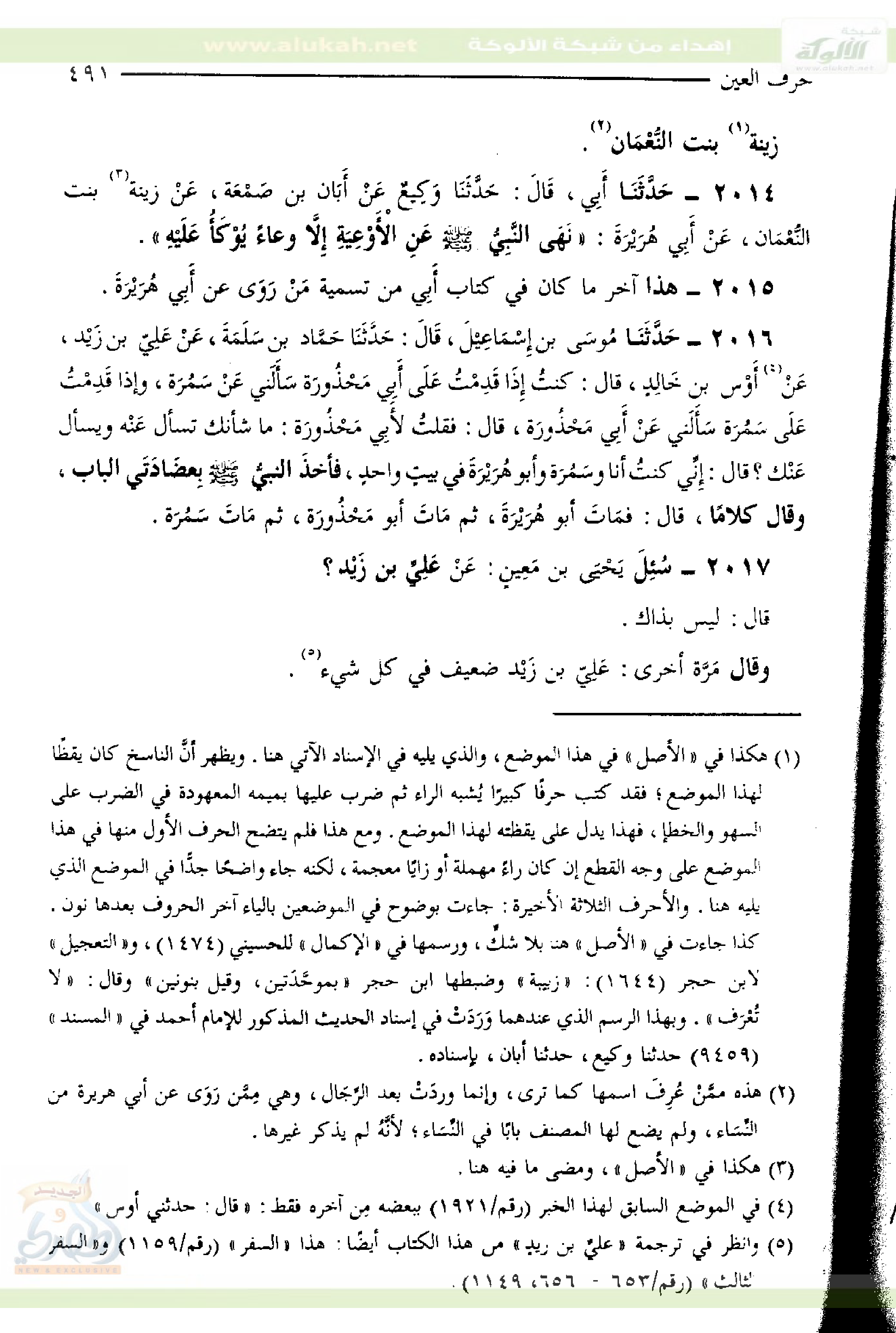 ٢٠١٤- حَدَّثَنَا أَبِي، قَالَ: حَدَّثَنَا وَكِيعٌ عَنْ أَبَان بْنِ صَمْعَة، عَنْ زينة بِنْتِ النُّعْمَان، عَنْ أَبِي هُرَيْرَةَ "نَهَىَ النَّبِيُّ صَلَّى اللَّهُ عَلَيْهِ وسلم عَنِ الأَوْعِيَةِ إِلَاّ وِعَاءً يُوْكَأُ عَلَيْهِ".