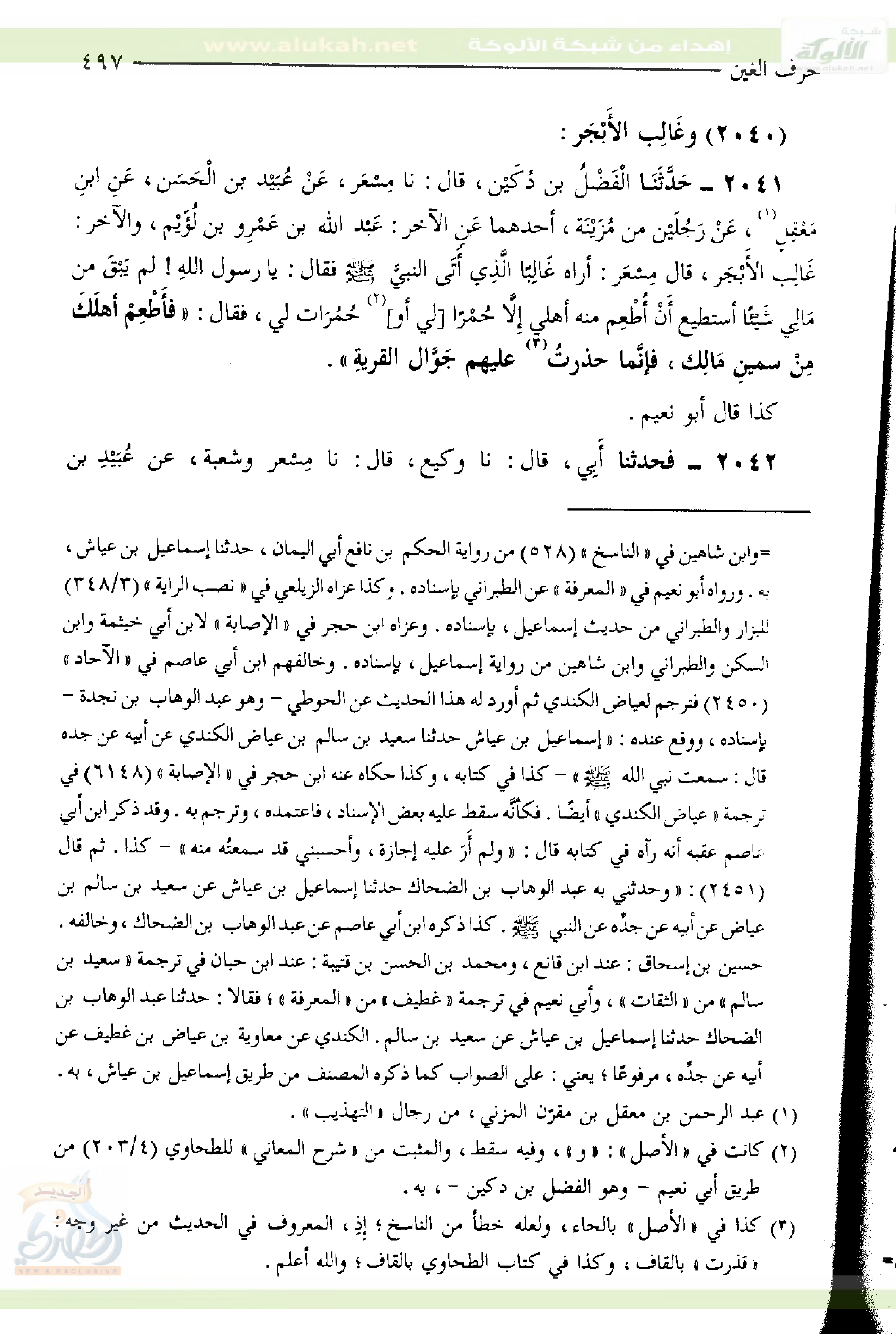 ٢٠٤١- حَدَّثَنَا الْفَضْلُ بْنُ دُكَيْن، قال: حَدَّثَنا مِسْعَر، عَنْ عُبَيْد بْنِ الْحَسَن، عَنِ ابنِ مَعْقِلٍ، عَنْ رَجُلَيْن من مُزَيْنَة، أحدهما عَنِ الآخر: عَبْد اللَّهِ بْنِ عَمْرِو بْنِ لُؤَيْم، وَالآخَرُ: غَالِب الأَبْجَر، قَالَ مِسْعَر: أراه غَالِب الَّذِي أَتَى النبيَّ صَلَّى اللَّهُ عَلَيْهِ وَسَلَّمَ فَقَالَ: يَا رَسُولَ اللهِ! لَمْ يَبْقَ مِنْ مَالِي شَيْئًا أَسْتَطِيعُ أَنْ أُطْعِم مِنْهُ أَهْلِي إِلَاّ حمْرًا وَحُمُرَاتٍ لِي، فَقَالَ: فأَطْعِمْ أهلَكَ مِنْ سمينِ مَالِك، فإنَّما حذرتُ عَلَيْهِمْ جَوَّال القريةِ"، كَذَا قَالَ أَبُو نُعَيْمٍ.
