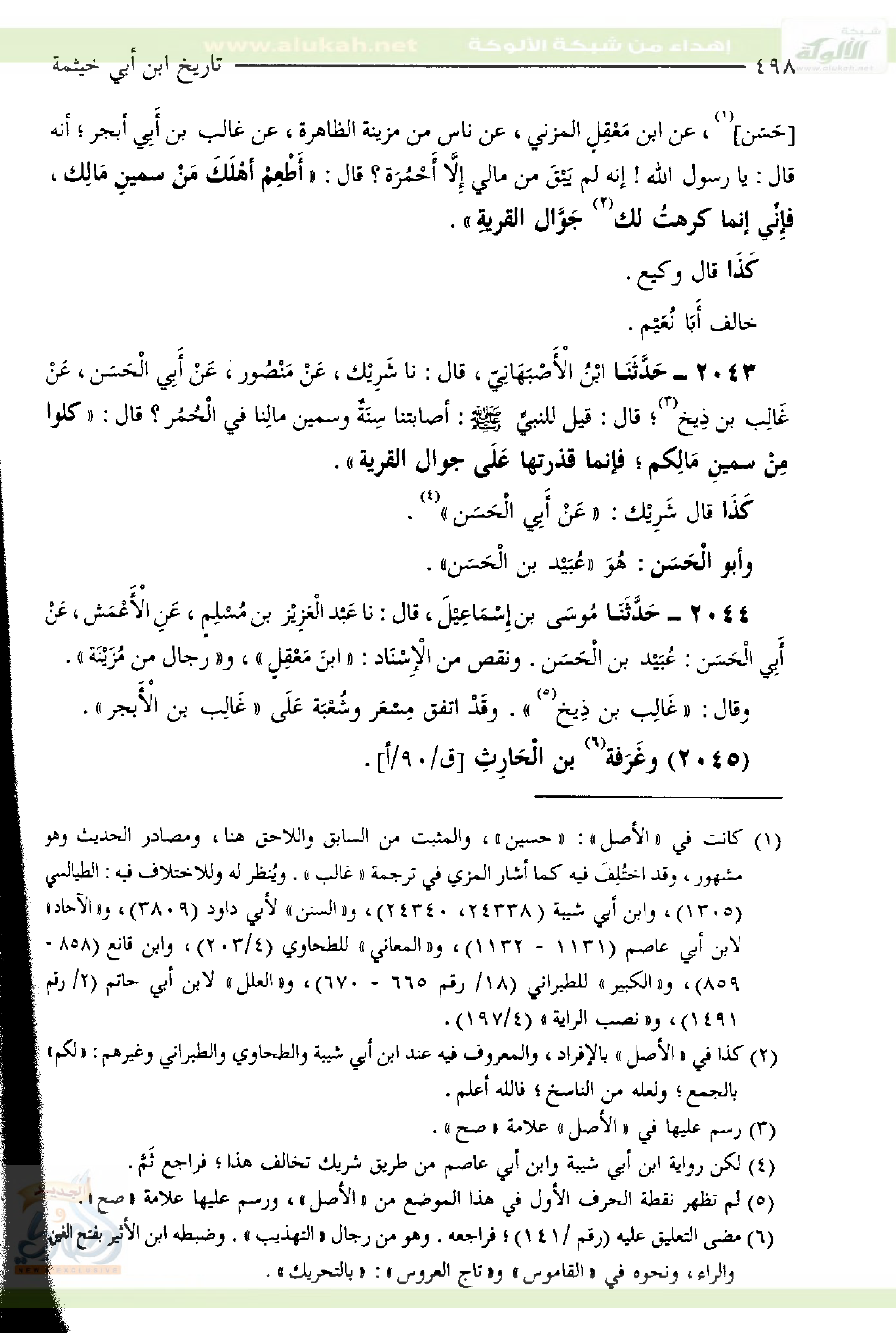 ٢٠٤٣- حَدَّثَنَا ابْنُ الأَصْبَهَانِيّ، قَالَ: حَدَّثَنا شَرِيْك، عَنْ مَنْصُور، عَنْ أَبِي الْحَسَن، عَنْ غَالِب بْنِ ذِيخ قَالَ: قِيلَ للنبيِّ صَلَّى اللَّهُ عَلَيْهِ وَسَلَّمَ: أَصَابَتْنَا سِنَةٌ وَسَمِينُ مالِنا فِي الْحُمُر قَالَ: كُلُوا مِنْ سمينِ مَالِكم؛ فَإِنَّمَا قَذَّرْتُهَا عَلَى جَوَّالِ الْقَرْيَةِ"، كَذَا قَالَ شَرِيْك: عَنْ أَبِي الْحَسَن".