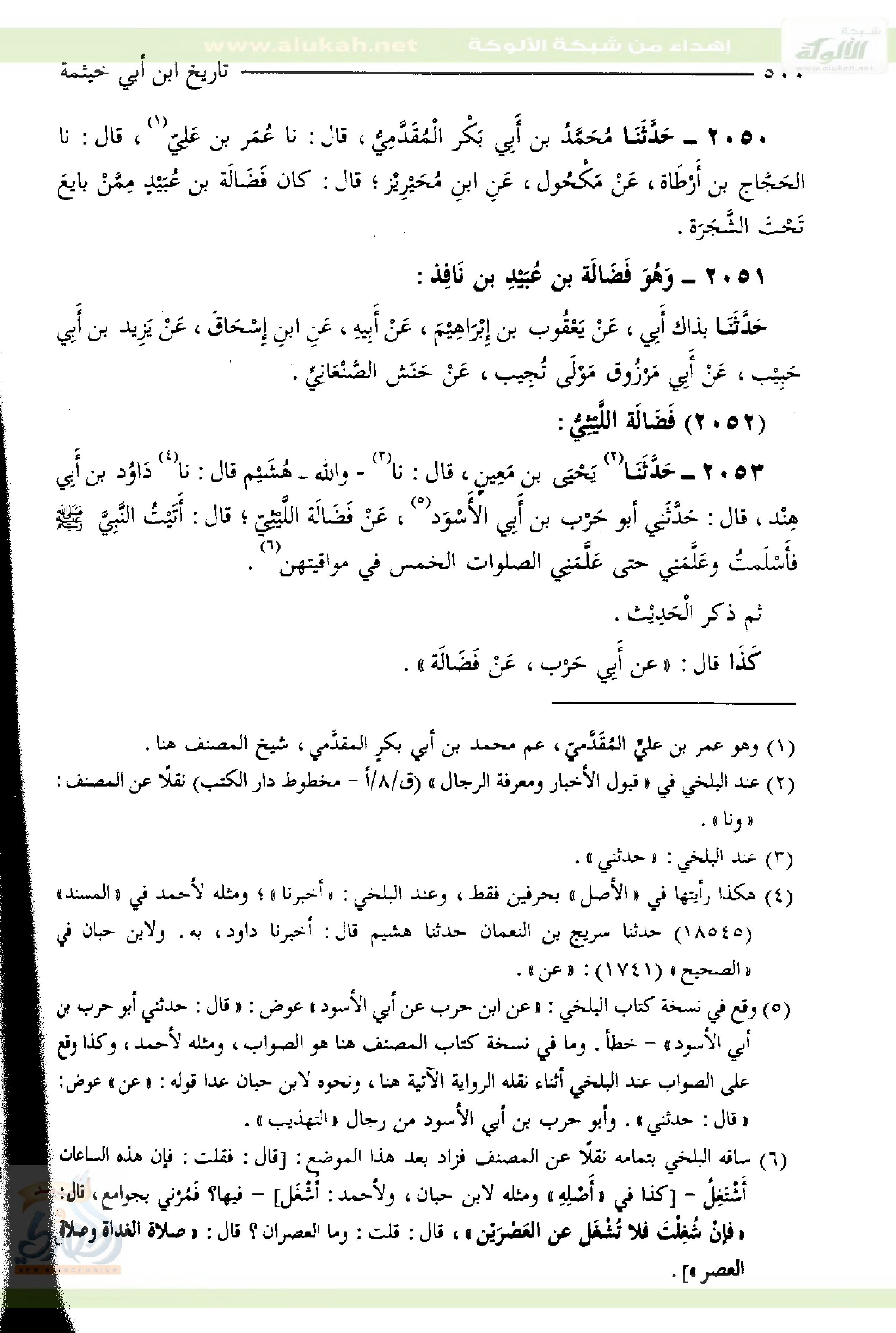 ٢٠٥٣- حَدَّثَنَا يَحْيَى بْنُ مَعِينٍ، قال: حَدَّثَنا – والله - هُشَيْم قال: حَدَّثَنا دَاوُد بْنُ أَبِي هِنْد، قَالَ: حَدَّثَنِي أَبُو حَرْب بْنُ أَبِي الأَسْوَد، عَنْ فَضَالَة اللَّيْثِيّ؛ قَالَ: أَتَيْتُ النَّبِيَّ صَلَّى اللَّهُ عَلَيْهِ وَسَلَّمَ فأَسْلَمتُ وعَلَّمَنِي حَتَّى عَلَّمَنِي الصَّلَوَاتِ الْخَمْسِ فِي مَوَاقِيتِهِنَّ، ثُمَّ ذَكَرَ الْحَدِيْث، كَذَا قَالَ: عَنْ أَبِي حَرْب، عَنْ فَضَالَة".