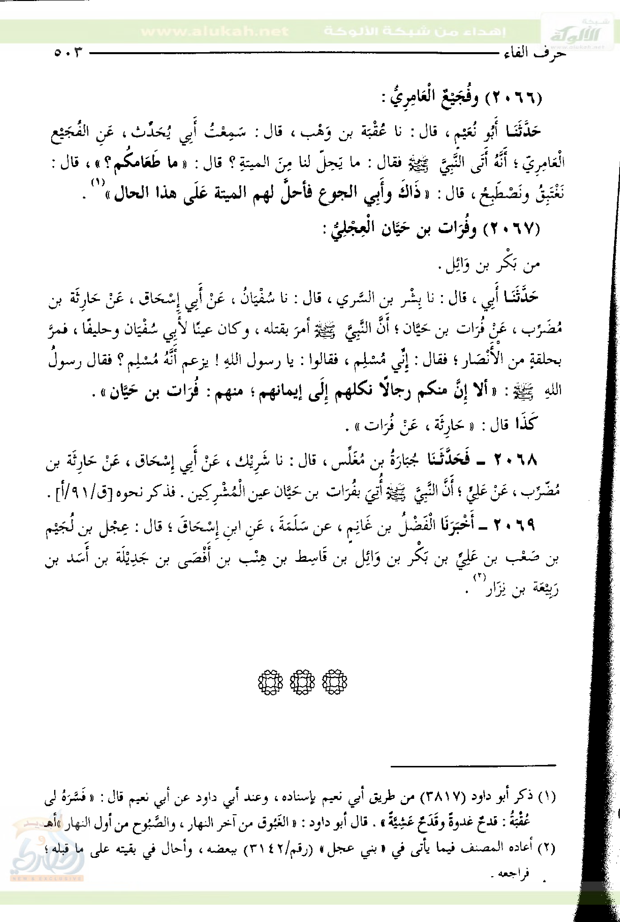 حَدَّثَنَا أَبِي، قال: حَدَّثَنا بِشْر بن السَّري، قال: حَدَّثَنا سُفْيَانُ، عَنْ أَبِي إِسْحَاق، عَنْ حَارِثَة بْنِ مُضَرِّب، عَنْ فُرَات بْنِ حَيَّان؛ أَنَّ النَّبِيَّ صَلَّى اللَّهُ عَلَيْهِ وَسَلَّمَ أمرَ بِقَتْلِهِ، وَكَانَ عَيْنًا لأَبِي سُفْيَان وَحَلِيفًا، فمرَّ بحلقةٍ مِنَ الأَنْصَار؛ فَقَالَ: إِنِّي مُسْلِم، فَقَالُوا: يَا رَسُولَ اللهِ يَزْعُمُ أَنَّهُ مُسْلِم؟ فَقَالَ رسولُ اللهِ صَلَّى اللَّهُ عَلَيْهِ وَسَلَّمَ: أَلا إِنَّ مِنْكُمْ رِجَالا نَكِلُهُمْ إِلَى إيمانهم؛ منهم: فُرَات بْنُ حَيَّان"، كَذَا قَالَ: حَارِثَة، عَنْ فُرَات".