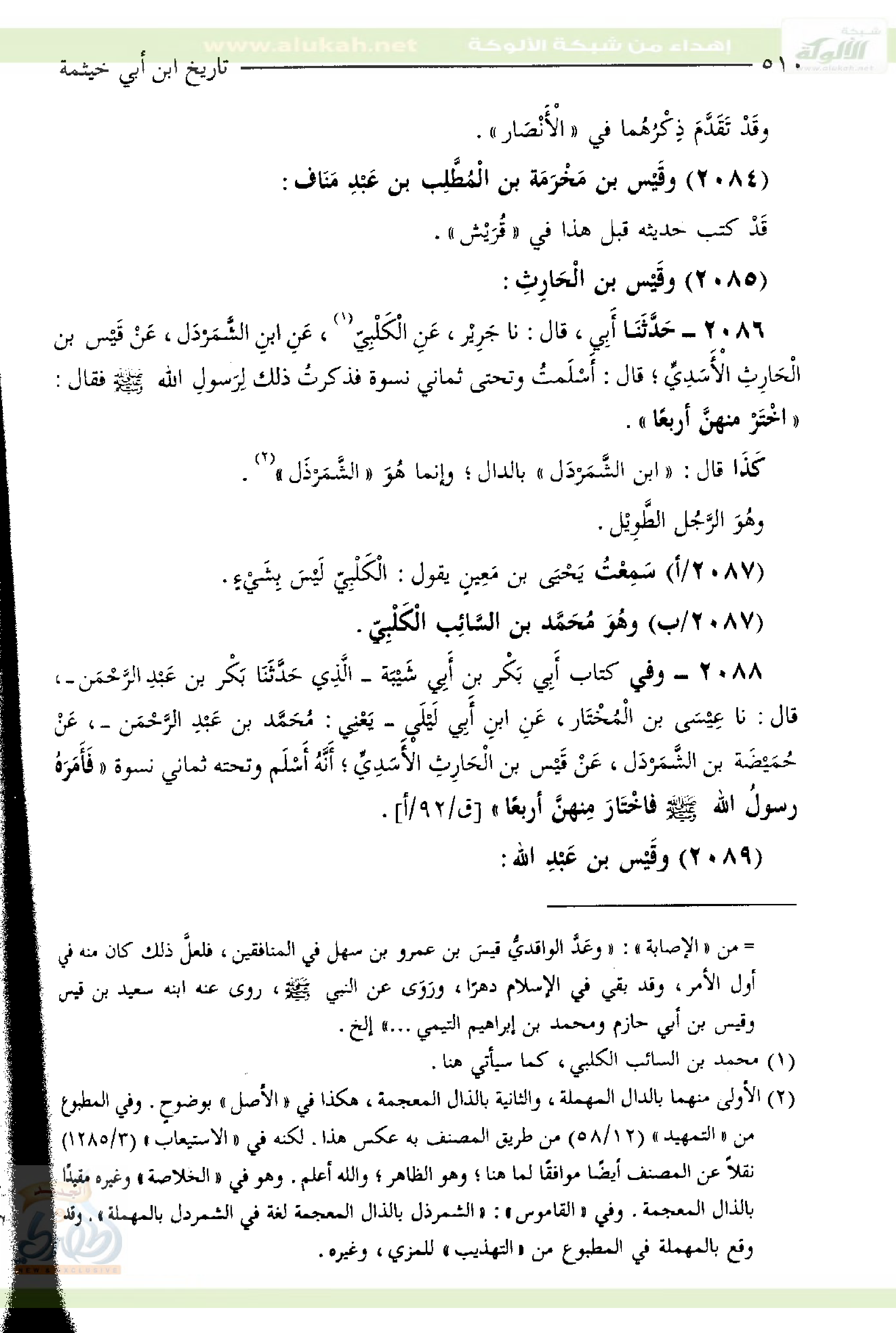 ٢٠٨٦- حَدَّثَنَا أَبِي، قال: حَدَّثَنا جَرِيْر، عَنِ الْكَلْبِيّ، عَنِ ابنِ الشَّمَرْدَل، عَنْ قَيْس بْنِ الْحَارِثِ الأَسَدِيِّ؛ قَالَ: أَسْلَمت وَتَحْتِي ثَمَانِي نِسْوَةً فَذَكَرْتُ ذَلِكَ لِرَسولِ اللَّهِ صَلَّى اللَّهُ عَلَيْهِ وَسَلَّمَ فَقَالَ: اخْتَرْ مِنْهُنَّ أَرْبَعًا"، كَذَا قَالَ: ابْنَ الشَّمَرْدَل بِالدَّالِ؛ وَإِنَّمَا هُوَ "الشَّمَرْذَل"، وهُوَ الرَّجُل الطَّوِيْل.