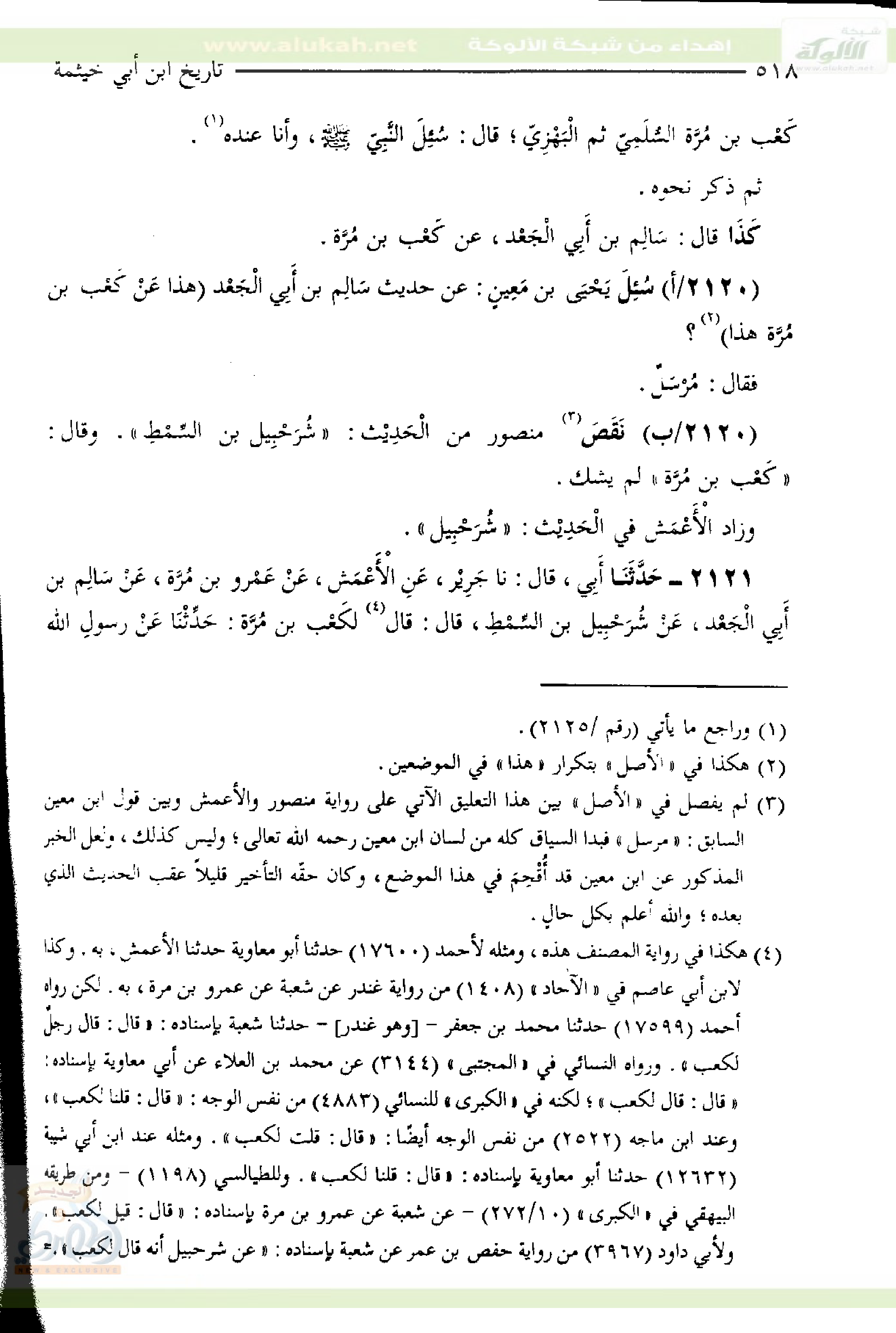 ٢١٢٠/أ- سُئِلَ يَحْيَى بْنُ مَعِينٍ: عَنْ حَدِيثِ سَالِم بْنِ أَبِي الْجَعْد هَذَا عَنْ كَعْب بْنِ مُرَّة هذا) ؟ فقال: مُرْسَلٌ.