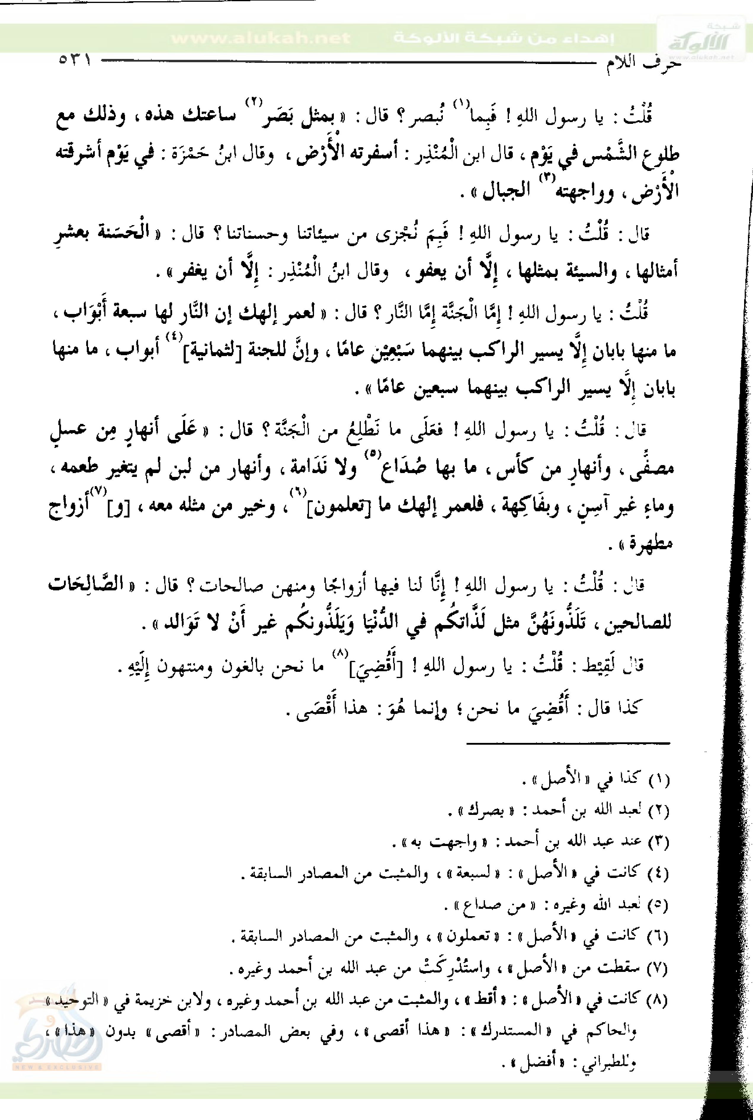 قُلْتُ: يَا رَسُولَ اللهِ! فَبِمَا نُبصر؟ قَالَ: بِمِثْلِ بَصَر سَاعَتِكَ هَذِهِ، وَذَلِكَ مَعَ طُلُوعِ الشَّمْس فِي يَوْم، قَالَ ابْنُ الْمُنْذِر: أسفرته الأَرْض، وقال ابنُ حَمْزَة: فِي يَوْم أَشْرَقَتْهُ الأَرْض، وَوَاجَهَتْهُ الْجِبَالُ".