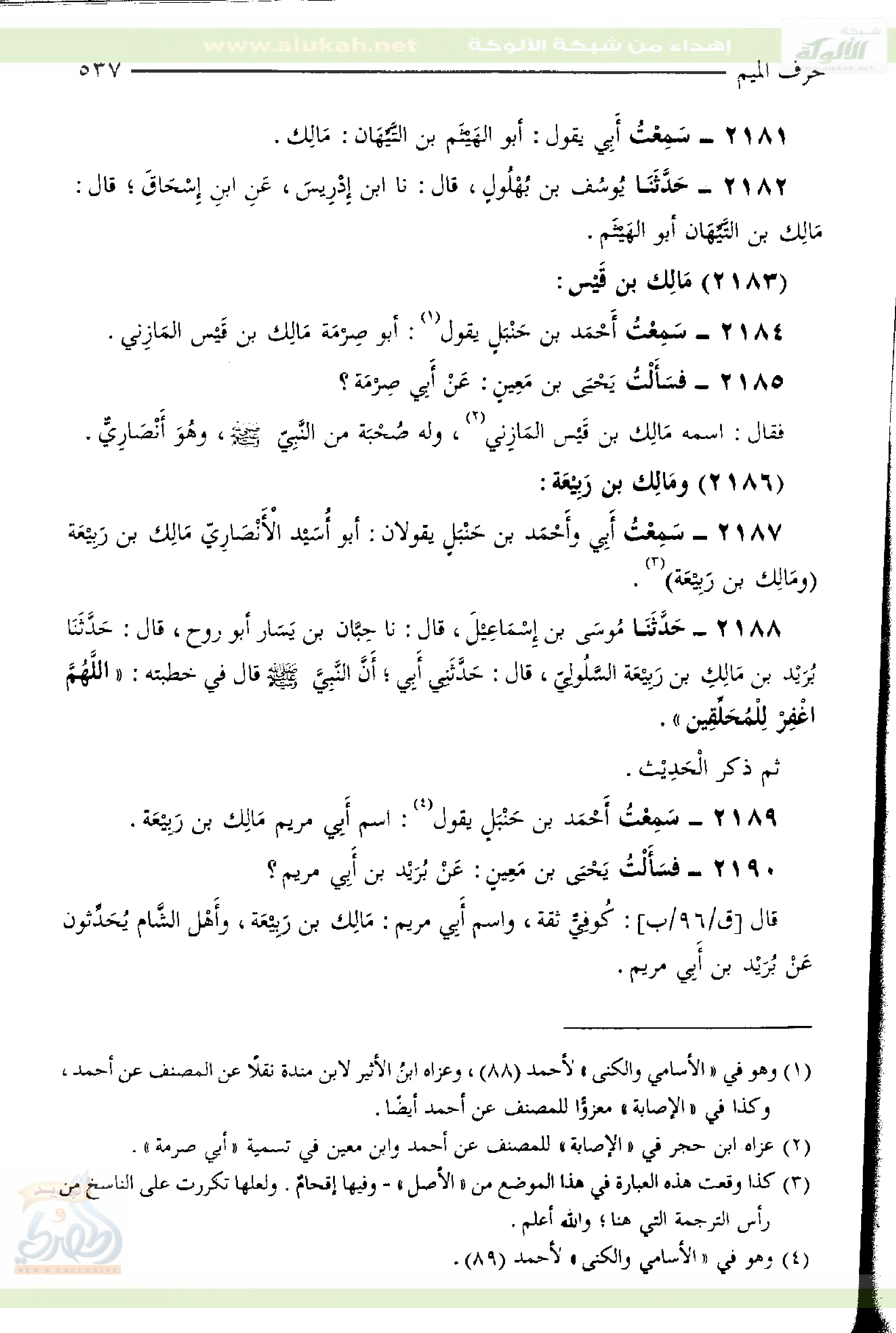 ٢١٨٤- سَمِعْتُ أَحْمَد بْنَ حَنْبَلٍ يَقُولُ: أَبُو صِرْمَةَ مَالِك بْنُ قَيْس المَازِني.