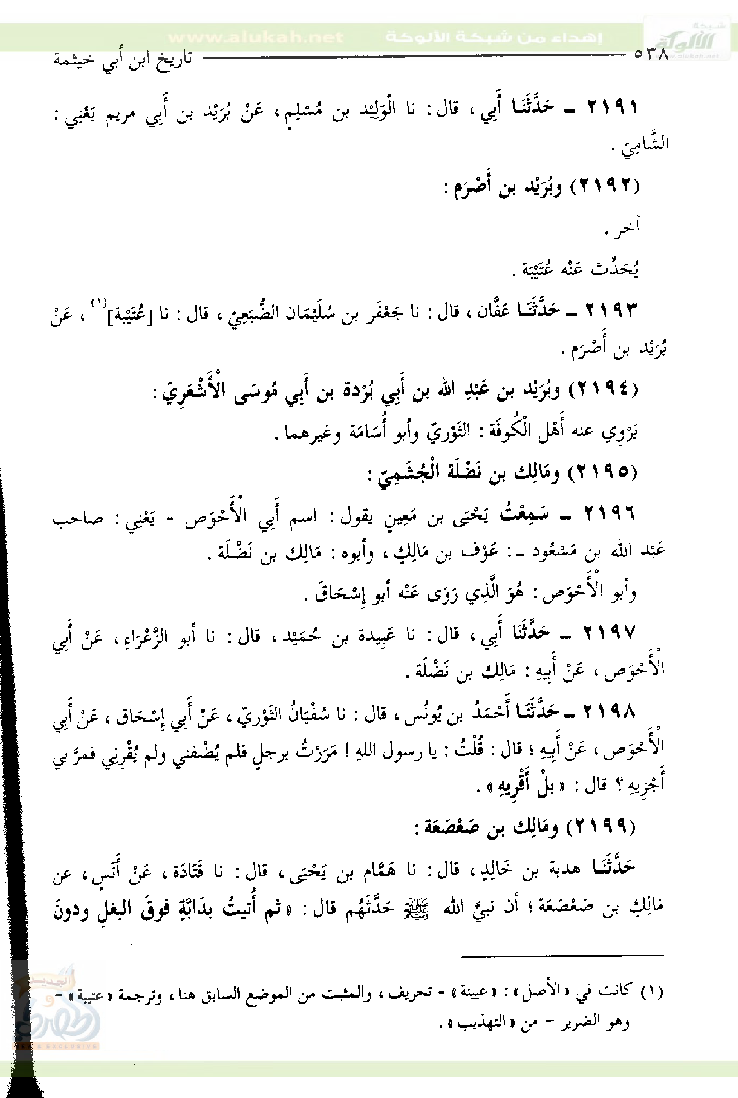 ٢١٩٦- سَمِعْتُ يَحْيَى بْنَ مَعِينٍ يَقُولُ: اسْمُ أَبِي الأَحْوَص – يَعْنِي: صَاحِبَ عَبْد اللَّهِ بْنِ مَسْعُود-: عَوْف بْنُ مَالِكٍ.