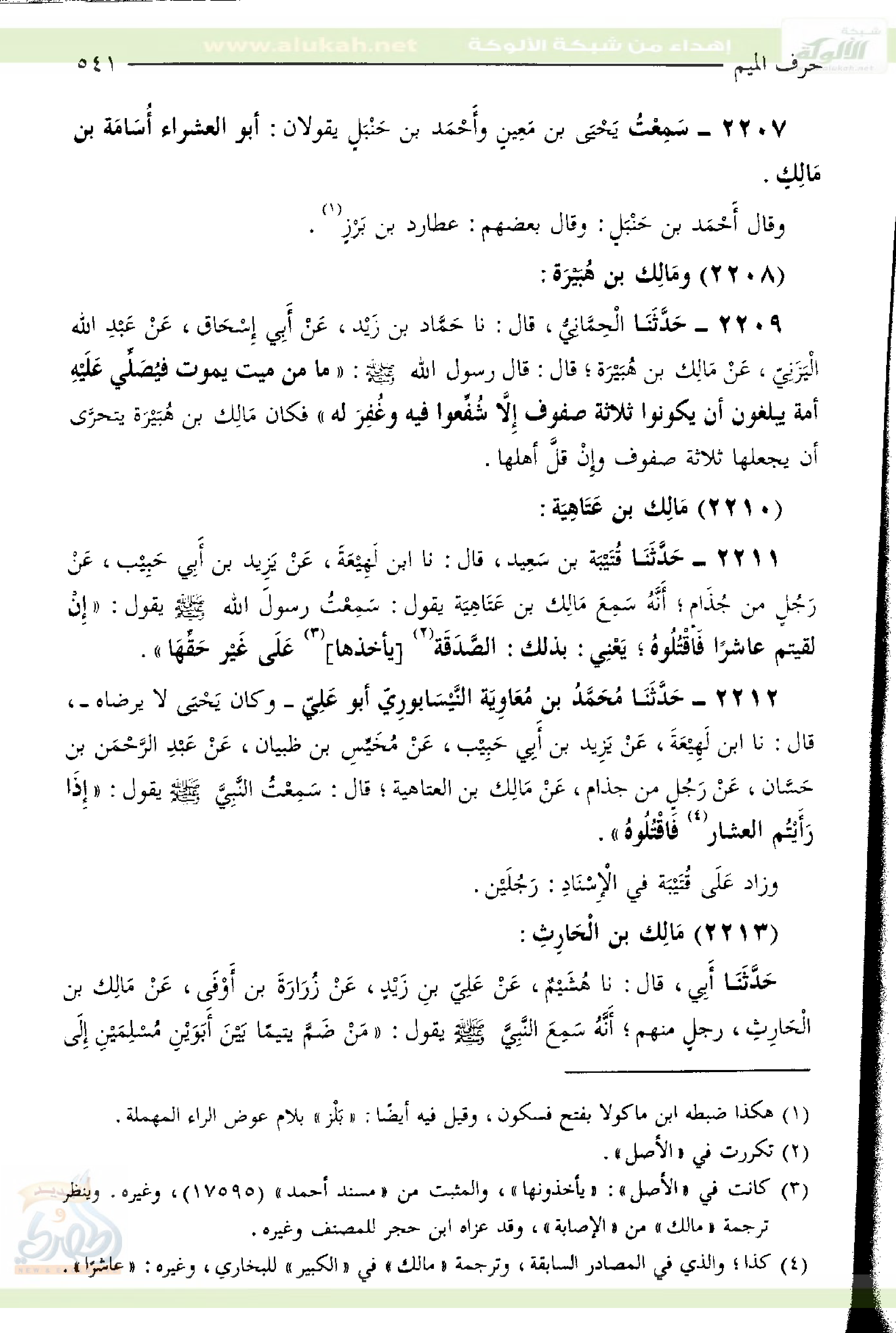 ٢٢٠٩- حَدَّثَنَا الْحِمَّانِيُّ، قَالَ: حَدَّثَنا حَمَّاد بْنُ زَيْد، عَنْ أَبِي إِسْحَاق، عَنْ عَبْدِ اللَّهِ الْيَزَنِيّ، عَنْ مَالِك بْنِ هُبَيْرَة؛ قَالَ: قَالَ رَسُولُ اللَّهِ صَلَّى اللَّهُ عَلَيْهِ وَسَلَّمَ: مَا مِنْ مَيِّتٍ يَمُوتُ فيُصَلِّي عَلَيْهِ أُمَّةٌ يَبْلُغُونَ أَنْ يَكُونُوا ثَلاثَةَ صُفُوفٍ إِلَاّ شُفِّعُوا فِيهِ وَغُفِرَ لَهُ" فَكَانَ مَالِك بْنُ هُبَيْرَة يتحرَّى أَنْ يَجْعَلَهَا ثَلاثَةَ صُفُوفٍ وإِنَّ قلَّ أَهْلُهَا.