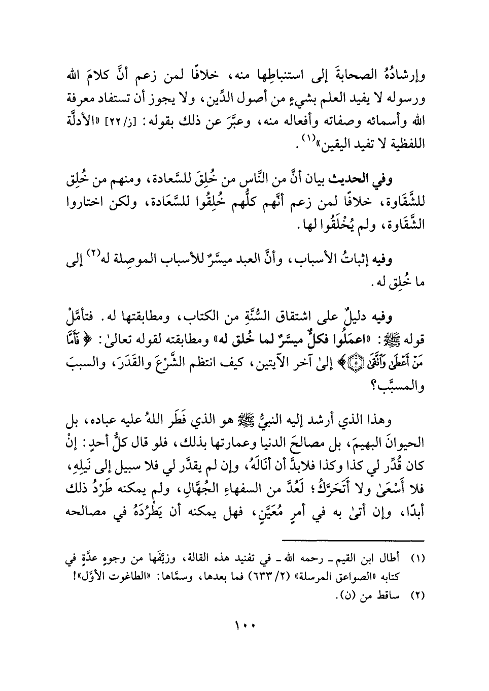 وفيه دليلٌ على اشتقاق السُّنَّةِ من الكتاب، ومطابقتها له. فتأمَّلْ قوله - صلى الله عليه وسلم -: "اعمَلُوا فكلٌّ ميسَّرٌ لما خُلق له" ومطابقته لقوله تعالى: {فَأَمَّا مَنْ أَعْطَى وَاتَّقَى (٥) } إلى آخر الآيتين، كيف انتظم الشَّرْعَ والقَدَرَ، والسببَ والمسبَّب؟