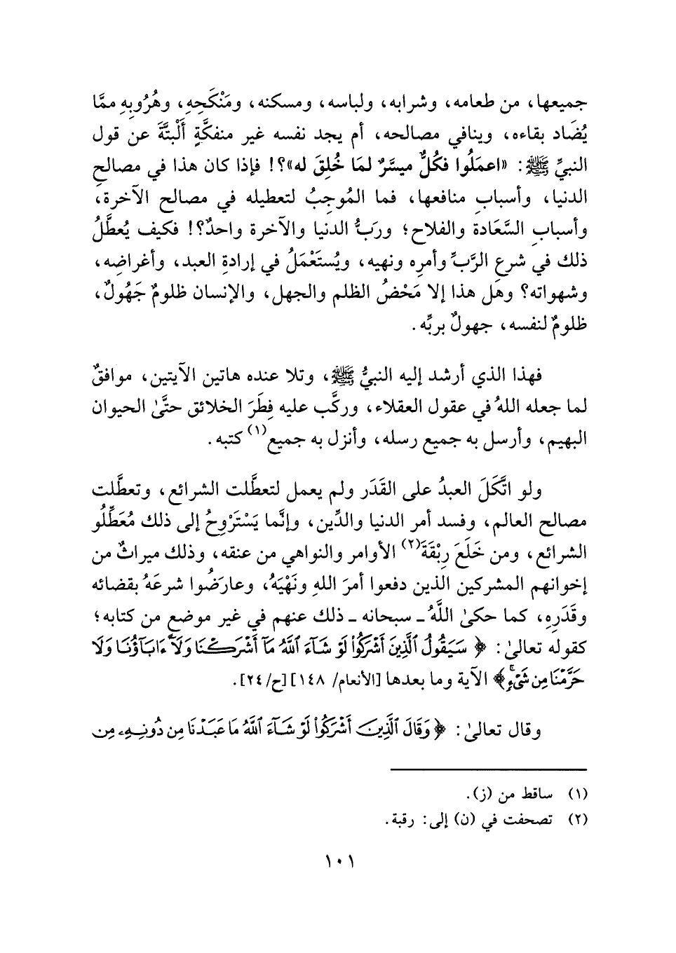 ولو اتَّكَلَ العبدُ على القَدَر ولم يعمل لتعطَّلت الشرائع، وتعطَّلت مصالح العالم، وفسد أمر الدنيا والدَّين، وإنَّما يَسْتَرْوِحُ إلى ذلك مُعَطِّلُو الشرائع، ومن خَلَعَ رِبْقَةَ (¬٢) الأوامر والنواهي من عنقه، وذلك ميراثٌ من إخوانهم المشركين الذين دفعوا أمرَ اللهِ ونَهْيَهُ، وعارَضوا شرعَهُ بقضائه وقَدَرِهِ، كما حكى اللهُ - سبحانه - ذلك عنهم في غير موضع من كتابه؛ كقوله تعالى: {سَيَقُولُ الَّذِينَ أَشْرَكُوا لَوْ شَاءَ اللَّهُ مَا أَشْرَكْنَا وَلَا آبَاؤُنَا وَلَا حَرَّمْنَا مِنْ شَيْءٍ} الآية وما بعدها [الأنعام: ١٤٨].