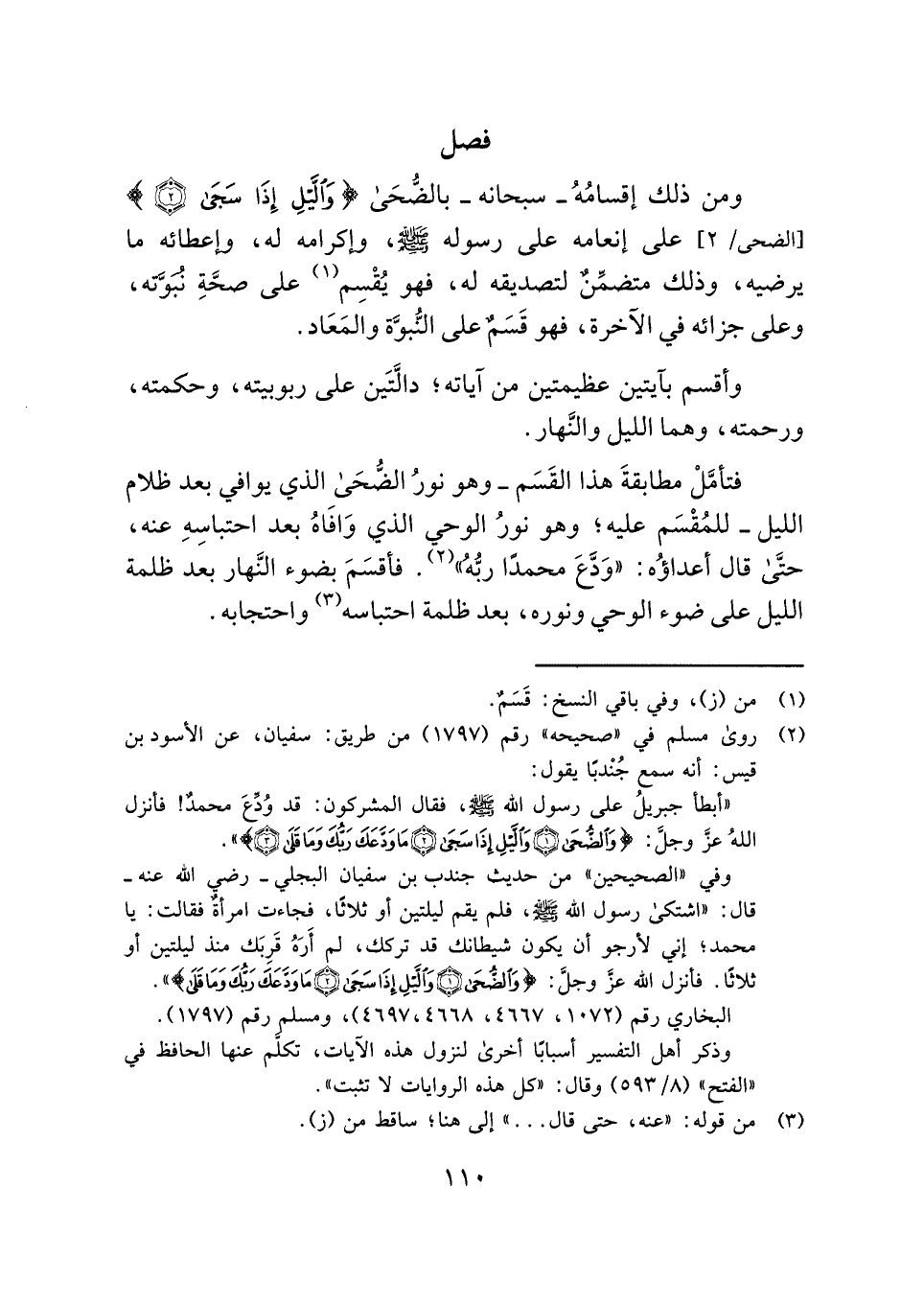 فتأمَّلْ مطابقةَ هذا القَسَم - وهو نورُ الضُّحَى الذي يوافي بعد ظلام الليل - للمُقْسَم عليه؛ وهو نورُ الوحي الذي وَافَاهُ بعد احتباسِهِ عنه، حتَّى قال أعداؤُه: "وَدَّع محمدًا ربُّهُ" (¬٢). فأقسَمَ بضوء النَّهار بعد ظلمة الليل على ضوء الوحي ونوره، بعد ظلمة احتباسه (¬٣) واحتجابه.