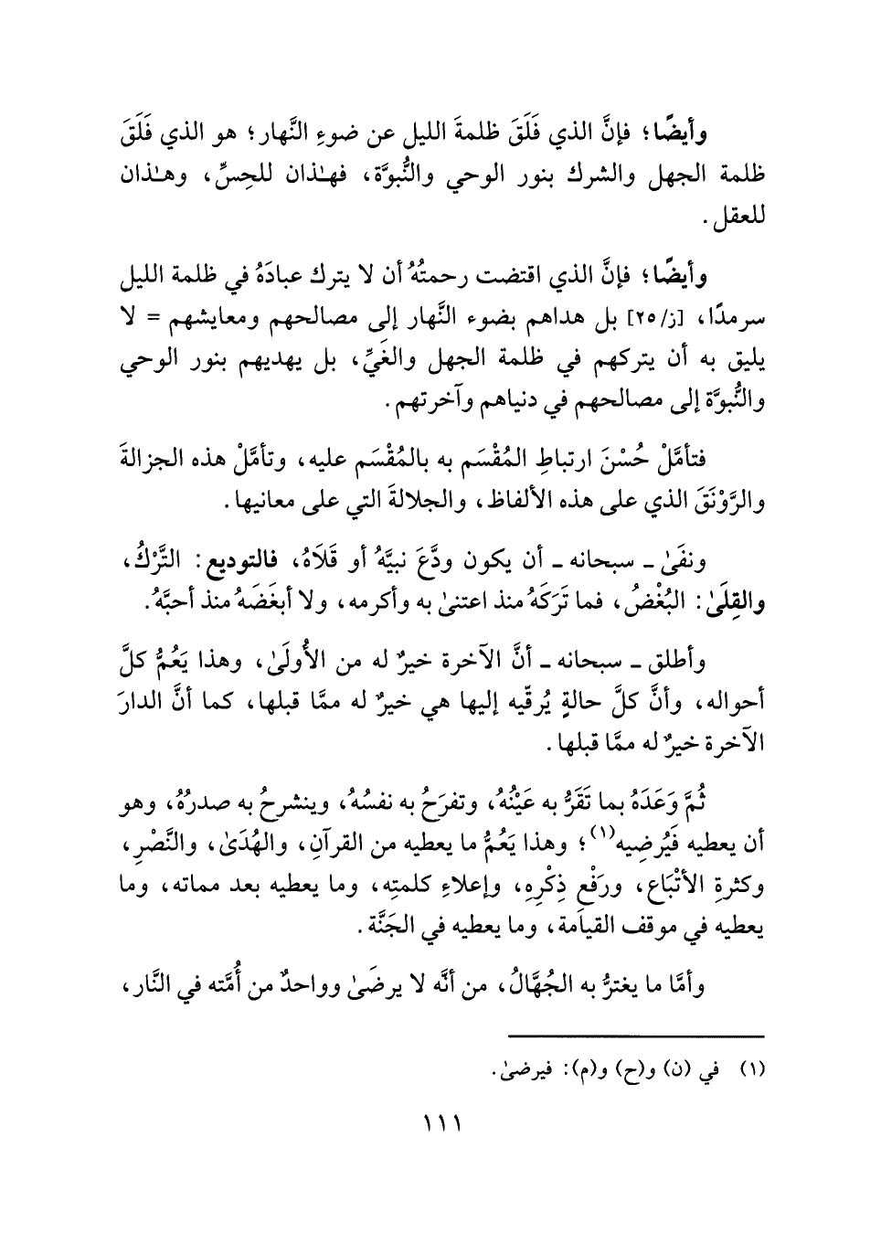 وأيضًا؛ فإنَّ الذي اقتضت رحمتُهُ أن لا يترك عبادَهُ في ظلمة الليل سرمدًا، بل هداهم بضوء النَّهار إلى مصالحهم ومعايشهم = لا يليق به أن يتركهم في ظلمة الجهل والغَيِّ، بل يهديهم بنور الوحي والنُّبوَّة إلى مصالحهم في دنياهم وآخرتهم.