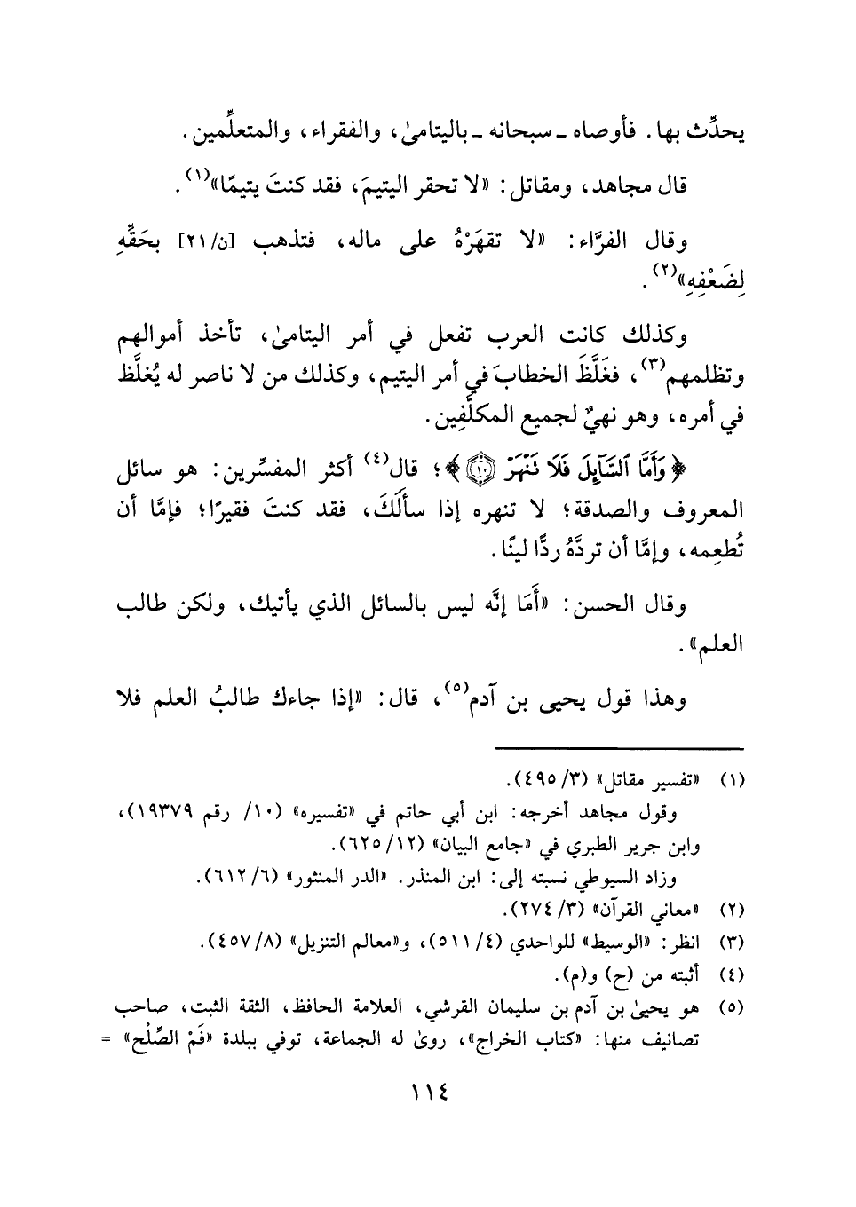 قال مجاهد، ومقاتل: "لا تحقر اليتيمَ، فقد كنتَ يتيمًا" (¬١).