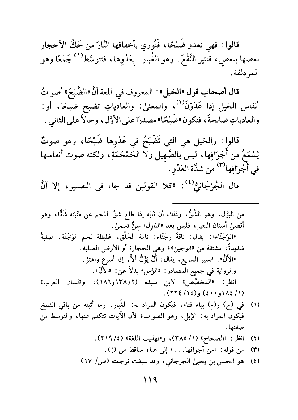 قالوا: والخيل هي التي تَضْبَحُ في عَدْوِها ضَبْحًا، وهو صوتٌ يُسْمَعُ من أَجْوَافِها، ليس بالصَّهِيل ولا الحَمْحَمَةِ، ولكنه صوت أنفاسها في أجْوَافِها (¬٣) من شدَّة العَدْوِ.