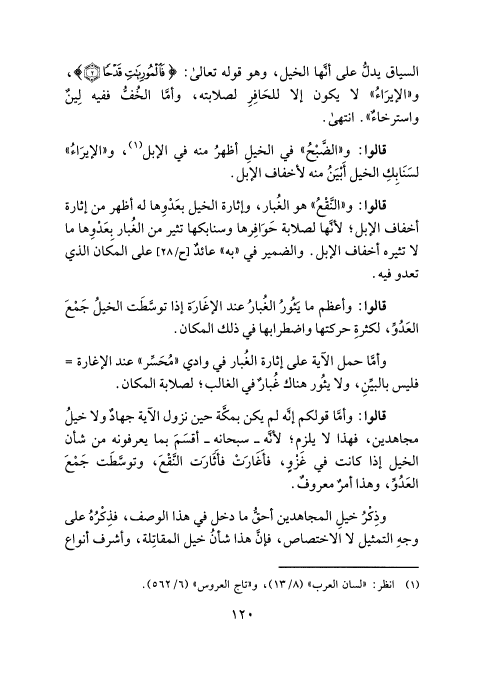قالوا: و"الضَّبْحُ" في الخيلِ أظهرُ منه في الإبل (¬١) ، و"الإيرَاءُ" لسَنَابِكِ الخيل أَبْيَنُ منه لأخفاف الإبل.