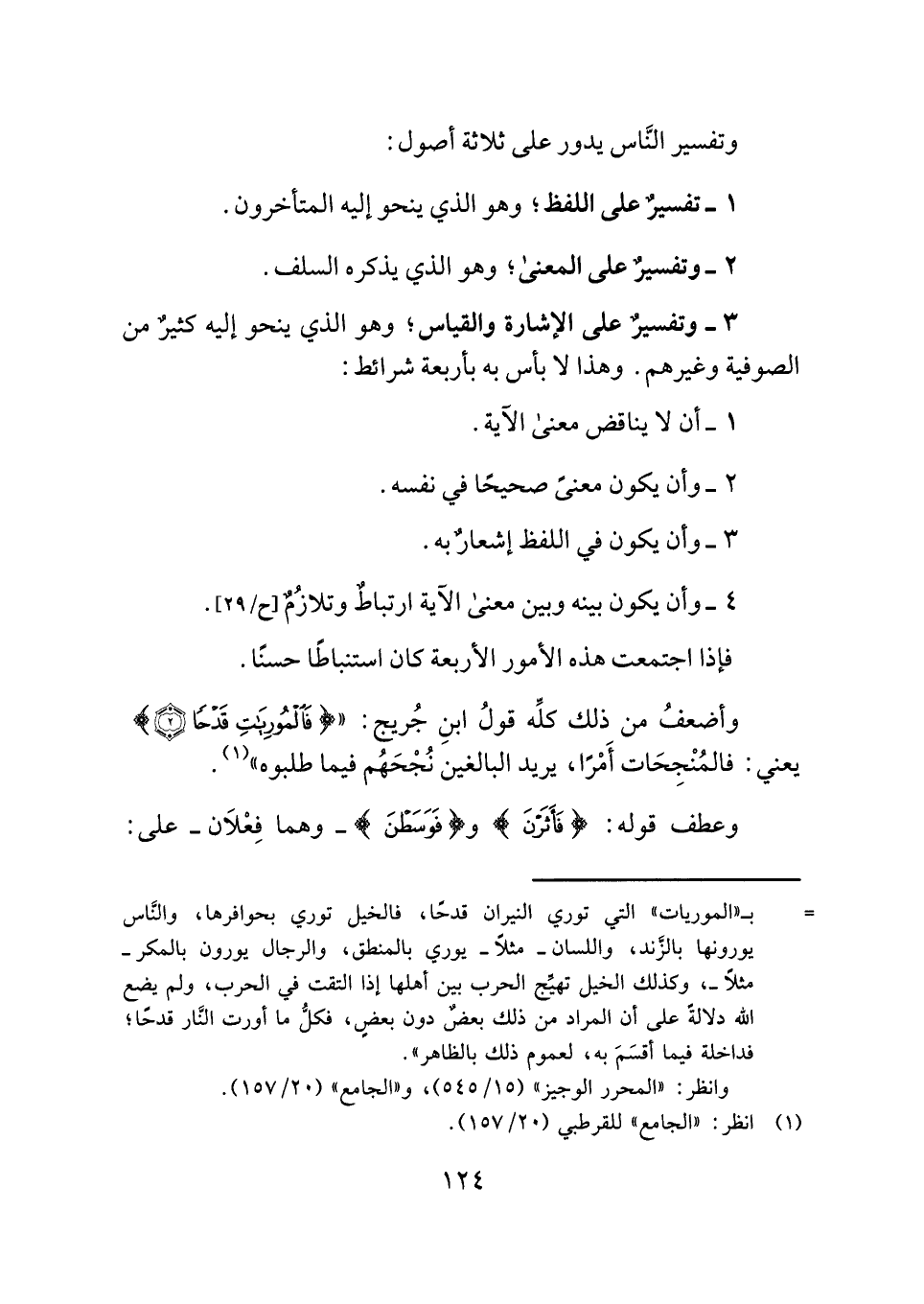 = بـ "الموريات" التي توري النيران قدحًا، فالخيل توري بحوافرها، والنَّاس يورونها بالزَّند، واللسان - مثلًا - يوري بالمنطق، والرجال يورون بالمكر - مثلًا -، وكذلك الخيل تهيِّج الحرب بين أهلها إذا التقت في الحرب، ولم يضع الله دلالةً على أن المراد من ذلك بعضٌ دون بعضٍ، فكلُّ ما أورت النَّار قدحًا؛ فداخلة فيما أقسَمَ به، لعموم ذلك بالظاهر".