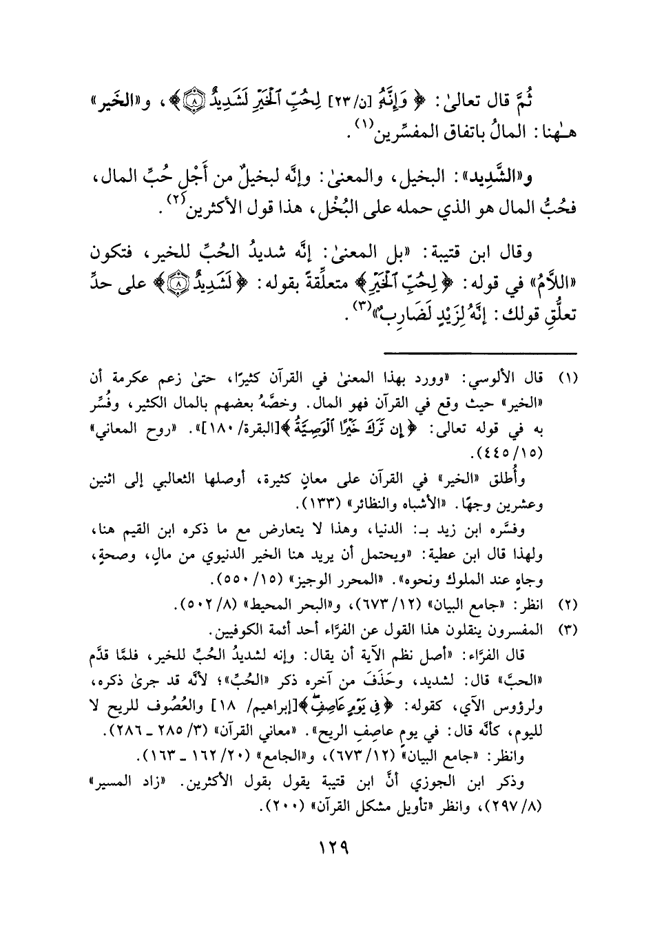 ثُمَّ قال تعالى: {وَإِنَّهُ لِحُبِّ الْخَيْرِ لَشَدِيدٌ (٨)}، و"الخَير" ها هنا: المالُ باتفاق المفسِّرين (¬١).