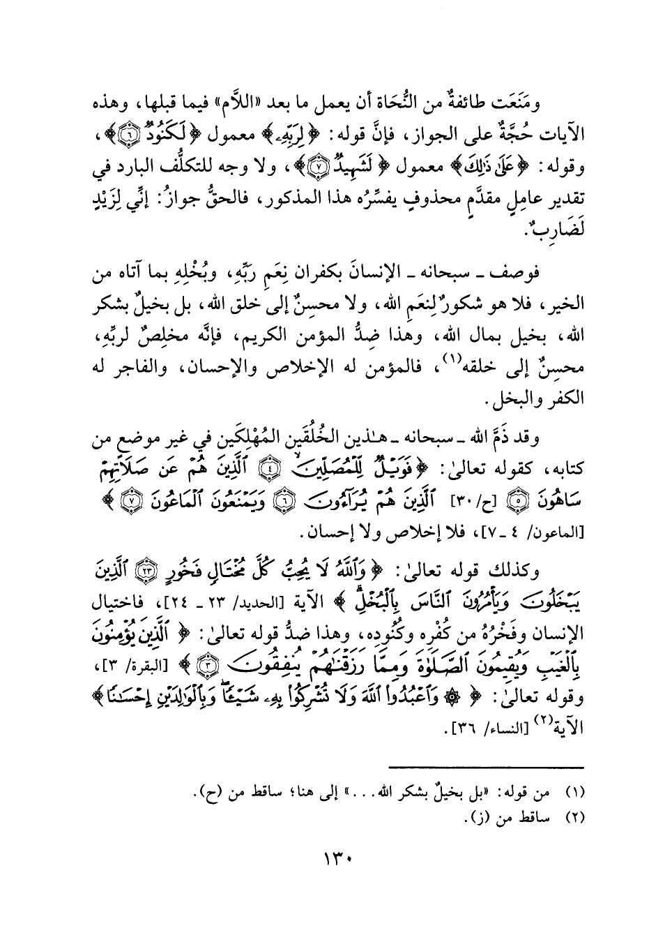 ومَنَعَت طائفةٌ من النُّحَاة أن يعمل ما بعد "اللَّام" فيما قبلها، وهذه الآيات حُجَّةٌ على الجواز، فإنَّ قوله: {لِرَبِّهِ} معمول {لَكَنُودٌ (٦) }، وقوله: {عَلَى ذَلِكَ} معمول {لَشَهِيدٌ (٧) }، ولا وجه للتكلُّف البارد في تقدير عامِلٍ مقدَّمٍ محذوفٍ يفسِّرُه هذا المذكور، فالحقُّ جوازُ: إنِّي لِزَيْدٍ لَضَارِبٌ.