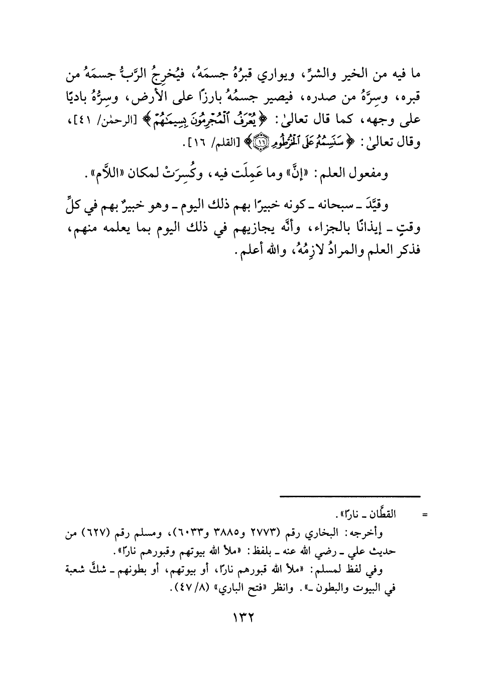 ما فيه من الخير والشرِّ، ويواري قبرُهُ جسمَهُ، فيُخرِجُ الرَّبُّ جسمَهُ من قبره، وسِرَّهُ من صدره، فيصير جسمُهُ بارزًا على الأرض، وسِرُّهُ باديًا على وجهه، كما قال تعالى: {يُعْرَفُ الْمُجْرِمُونَ بِسِيمَاهُمْ} [الرحمن: ٤١]، وقال تعالى: {سَنَسِمُهُ عَلَى الْخُرْطُومِ (١٦)} [القلم: ١٦].