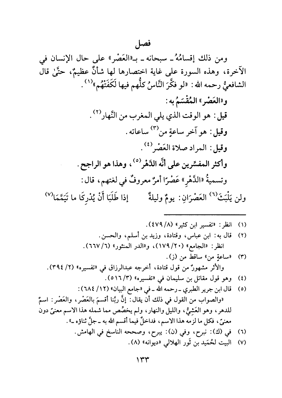 "والصواب من القول في ذلك أن يقال: إنَّ ربَّنا أقسمَ بالعَصْر، والعَصْر: اسمٌ للدهر، وهو العَشِيُّ، والليل والنهار، ولم يخصِّص مما شمله هذا الاسم معنىً دون معنىً، فكل ما لزمه هذا الاسم، فداخلٌ فيما أقسم الله به - جلَّ ثناؤه -".