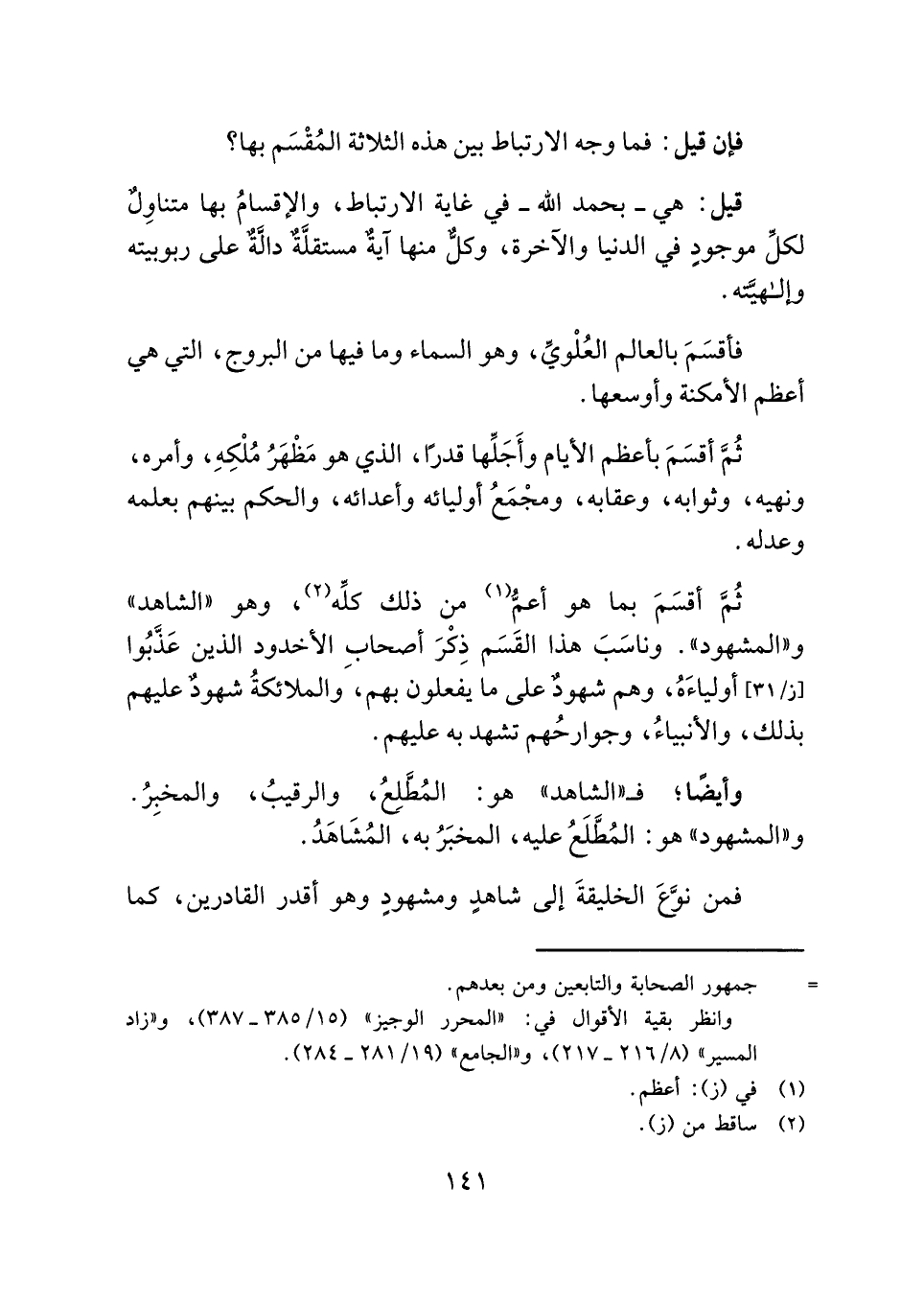 ثُمَّ أقسَمَ بأعظم الأيام وأَجَلِّها قدرًا، الذي هو مَظْهَرُ مُلْكِهِ، وأمره، ونهيه، وثوابه، وعقابه، ومجْمَعُ أوليائه وأعدائه، والحكم بينهم بعلمه وعدله.