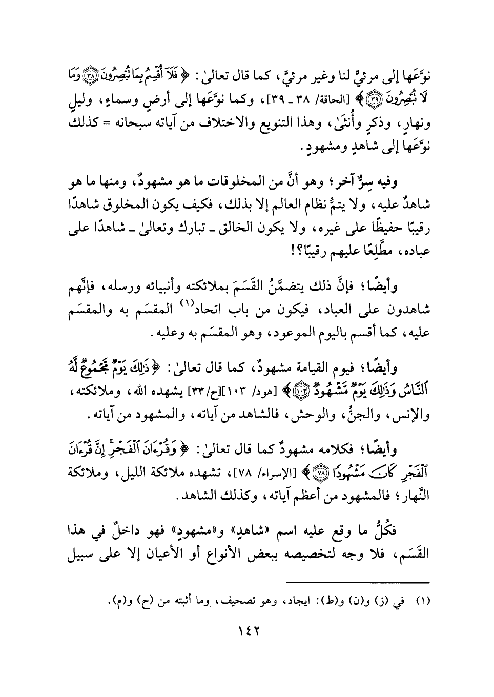 نوَّعَها إلى مرئيٍّ لنا وغير مرئيٍّ، كما قال تعالى: {فَلَا أُقْسِمُ بِمَا تُبْصِرُونَ (٣٨) وَمَا لَا تُبْصِرُونَ (٣٩) } [الحاقة: ٣٨, ٣٩]، وكما نوَّعَها إلى أرضٍ وسماءٍ، وليلٍ ونهارٍ، وذكرٍ وأُنثَى، وهذا التنويع والاختلاف من آياته سبحانه = كذلك نوَّعَها إلى شاهدٍ ومشهودٍ.