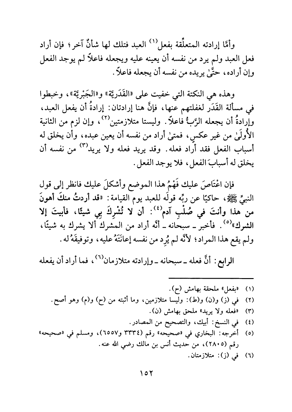 فإن اعْتَاصَ عليك فَهْمُ هذا الموضع وأشكلَ عليك فانظر إلى قول النبيِّ - صلى الله عليه وسلم -، حاكيًا عن ربِّه قولَه للعبد يوم القيامة: "قد أردتُ منكَ أهونَ من هذا وأنتَ في صُلْبِ آدم (¬٤) : أن لا تُشْرِكَ بِي شيئًا، فأبيتَ إلا الشرك" (¬٥) . فأخبر - سبحانه - أنَّه أراد من المشرك ألا يشرك به شيئًا، ولم يقع هذا المراد؛ لأنَّه لم يُرِد من نفسه إعانَتَهُ عليه، وتوفيقَهُ له.
