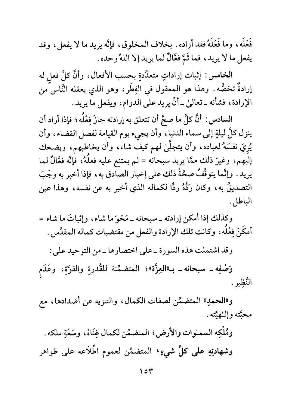 الخامس: إثبات إراداتٍ متعدِّدةٍ بحسب الأفعال، وأنَّ كلَّ فعلٍ له إرادةٌ تخصُّه. وهذا هو المعقول في الفِطَر، وهو الذي يعقله النَّاس من الإرادة، فشأنه - تعالى - أنْ يريد على الدوام، ويفعل ما يريد.