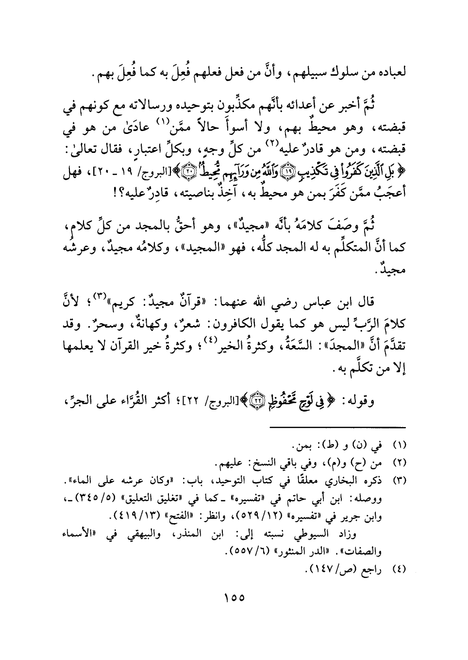 قال ابن عباس - رضي الله عنهما -: "قرآنٌ مجيدٌ: كريم" (¬٣)؛ لأنَّ كلامَ الرَّبِّ ليس هو كما يقول الكافرون: شعرٌ، وكهانةٌ، وسحرٌ. وقد تقدَّمَ أنَّ "المجدَ": السَّعَةُ، وكثرةُ الخير (¬٤)؛ وكثرةُ خير القرآن لا يعلمها إلا من تكلَّم به.