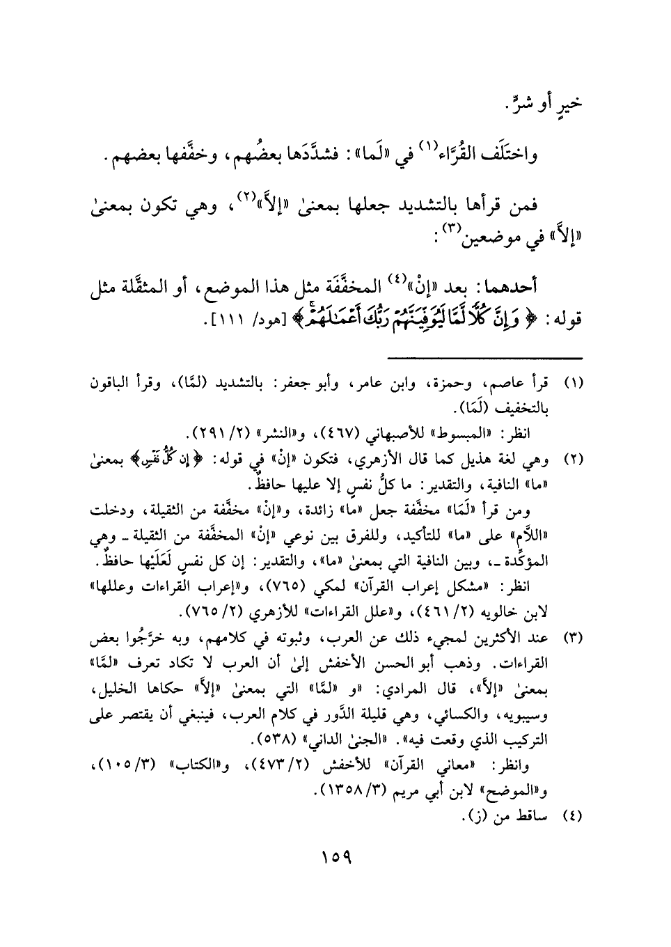 (¬٣) عند الأكثرين لمجيء ذلك عن العرب، وثبوته في كلامهم، وبه خرَّجُوا بعض القراءات. وذهب أبو الحسن الأخفش إلى أن العرب لا تكاد تعرف "لمَّا" بمعنى "إلَّا"، قال المرادي: "و"لمَّا" التي بمعنى "إلَّا" حكاها الخليل، وسيبويه، والكسائي، وهي قليلة الدَّور في كلام العرب، فينبغي أن يقتصر على التركيب الذي وقعت فيه". "الجنى الداني" (٥٣٨).