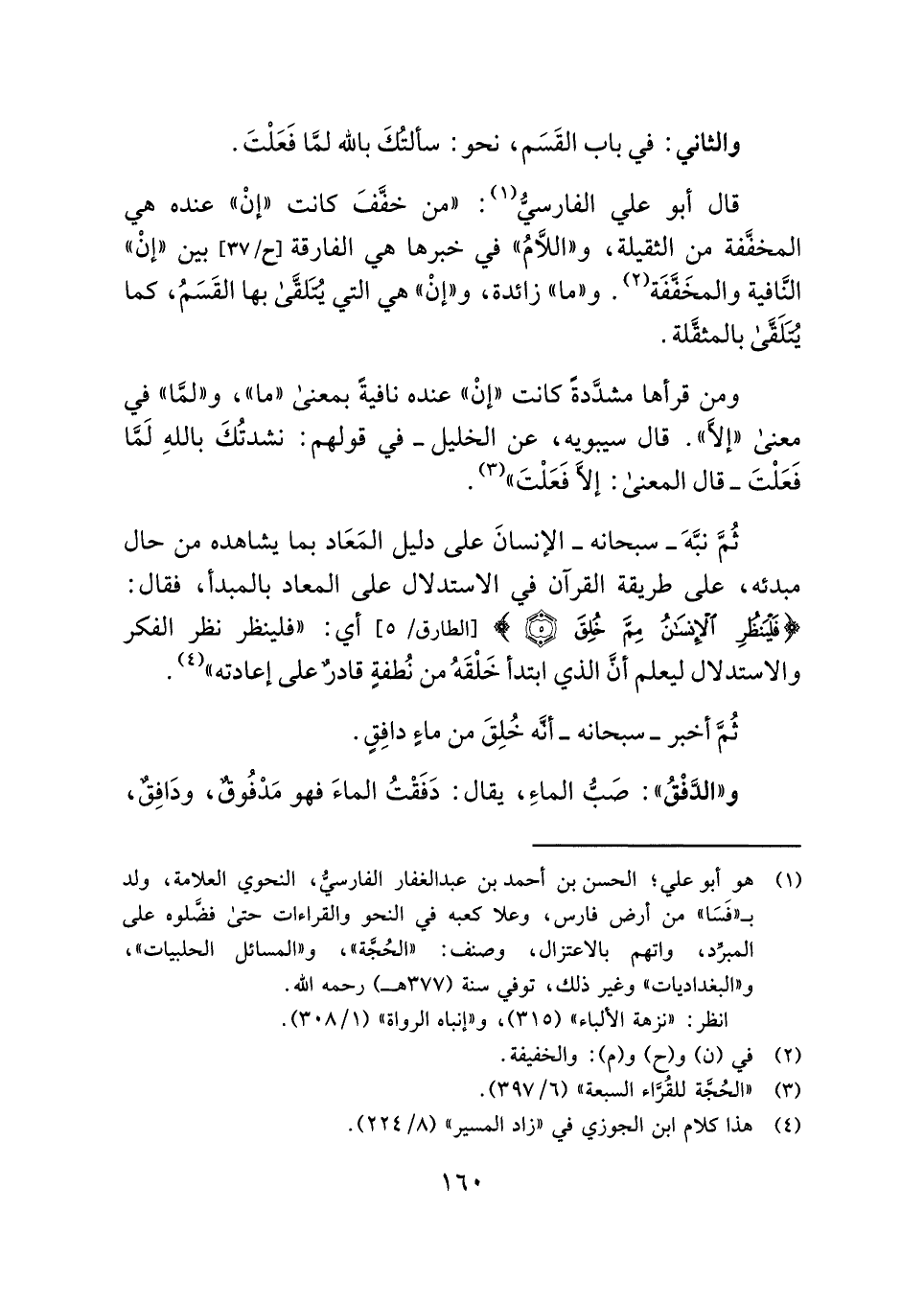 (¬١) هو أبو علي؛ الحسن بن أحمد بن عبد الغفار الفارسيُّ، النحوي العلامة، ولد بـ "فَسَا" من أرض فارس، وعلا كعبه في النحو والقراءات حتى فضَّلوه على المبرِّد، واتهم بالاعتزال، وصنف: "الحُجَّة"، و"المسائل الحلبيات"، و"البغداديات" وغير ذلك، توفي سنة (٣٧٧ هـ) رحمه الله.