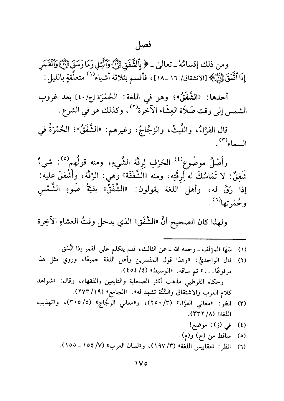 قال الفرَّاءُ، واللَّيثُ، والزجَّاجُ، وغيرهم: "الشَّفَقُ"؛ الحُمْرَةُ في السماء (¬٣).