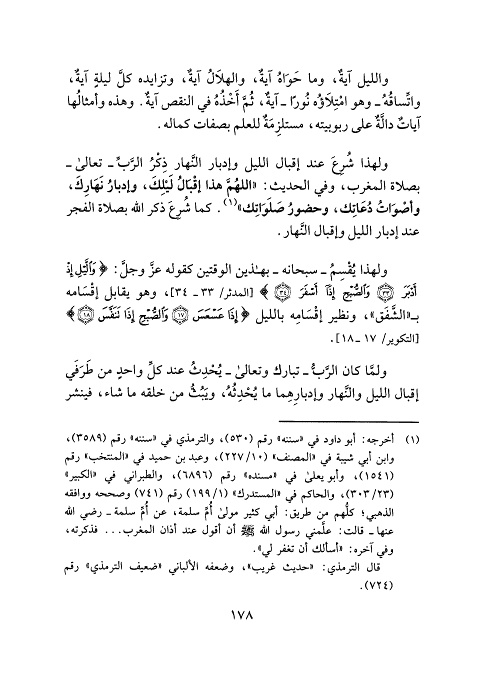 ولهذا شُرِعَ عند إقبال الليل وإدبار النَّهار ذِكْرُ الرَّبِّ - تعالى - بصلاة المغرب، وفي الحديث: "اللهُمَّ هذا إقْبالُ لَيْلِكَ، وإدبارُ نَهَارِكَ، وأصْوَاتُ دُعَاتِك، وحضورُ صَلَوَاتِك" (¬١) . كما شُرِعَ ذكر الله بصلاة الفجر عند إدبار الليل وإقبال النَّهار.