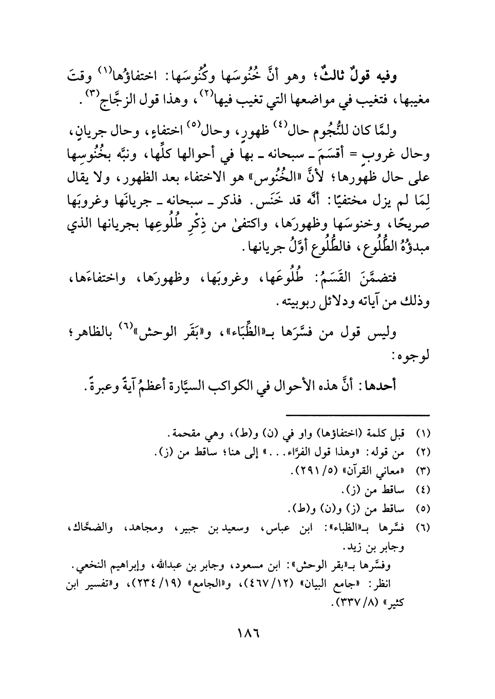 ولمَّا كان للنُّجُوم حال (¬٤) ظهورٍ، وحال (¬٥) اختفاءٍ، وحال جريانٍ، وحال غروبٍ - أقسَمَ - سبحانه - بها في أحوالها كلِّها، ونبَّه بخُنُوسِها على حال ظهورها؛ لأنَّ "الخُنُوس" هو الاختفاء بعد الظهور، ولا يقال لِمَا لم يزل مختفيًا: أنَّه قد خَنَس. فذكر - سبحانه - جريانَها وغروبَها صريحًا، وخنوسَها وظهورَها، واكتفى من ذِكْرِ طُلُوعِها بجريانها الذي مبدؤُهُ الطُّلُوع، فالطُّلُوع أوَّلُ جريانها.