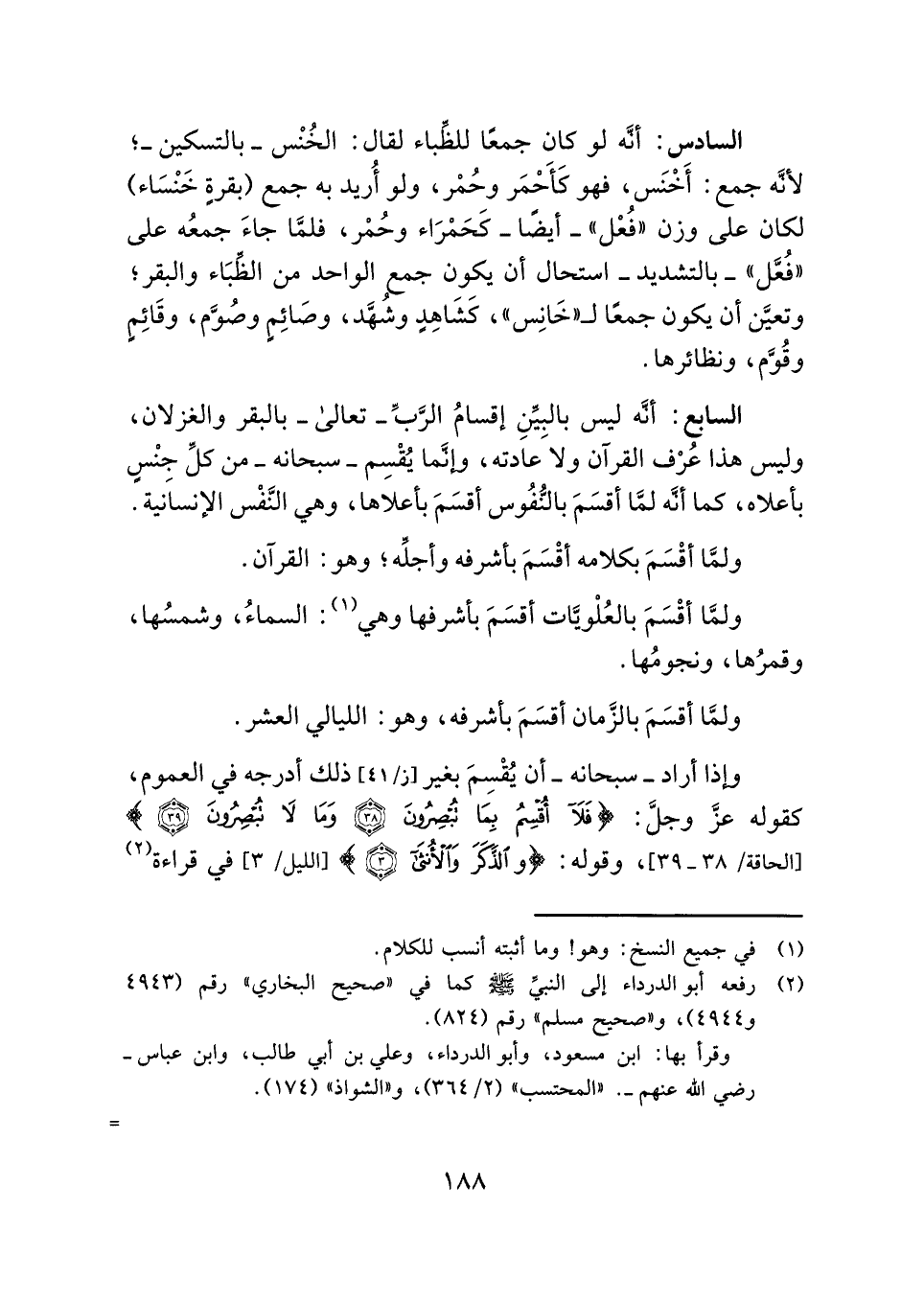 السادس: أنَّه لو كان جمعًا للظِّباء لقال: الخُنْس - بالتسكين -؛ لأنَّه جمع: أَخْنَس، فهو كَأَحْمَر وحُمْر، ولو أُريد به جمع (بقرةٍ خَنْسَاء) لكان على وزن "فُعْل" - أيضًا - كَحَمْرَاء وحُمْر، فلمَّا جاءَ جمعُه على "فُعَّل" - بالتشديد - استحال أن يكون جمع الواحد من الظِّبَاء والبقر؛ وتعيَّن أن يكون جمعًا لـ "خَانِس"، كَشَاهِدٍ وشُهَّد، وصَائِمٍ وصُوَّم، وقَائِمٍ وقُوَّم، ونظائرها.