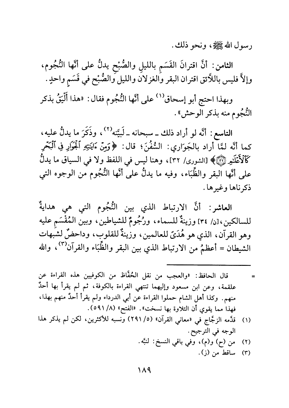 الثامن: أنَّ اقترانَ القَسَمِ بالليلِ والصُّبْحِ يدلُّ على أنَّها النُّجُوم، وإلَّا فليس باللَّائق اقتران البقر والغزلان والليل والصُّبْح في قَسَمٍ واحدٍ.