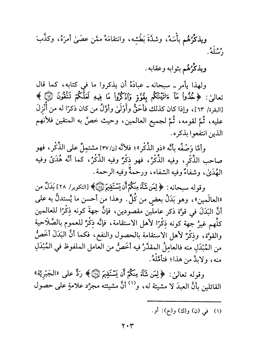 وقوله سبحانه: {لِمَنْ شَاءَ مِنْكُمْ أَنْ يَسْتَقِيمَ (٢٨)} [التكوير: ٢٨] بَدَلٌ من "العالَمين"، وهو بَدَلُ بعضٍ من كُلٍّ. وهذا من أحسن ما يُستدلُّ به على أنَّ البَدَلَ في قوَّة ذكر عاملين مقصودين، فإنَّ جهةَ كونه ذِكْرًا للعالمين كلِّهم غيرُ جهة كونه ذِكْرًا لأهل الاستقامة، فإنَّه ذِكْرٌ للعموم بالصَّلَاحية والقوَّة، وذِكْرٌ لأهل الاستقامة بالحصول والنفع، فكما أنَّ البَدَلَ أخَصُّ من المُبْدَلِ منه فالعامِلُ المقدَّرُ فيه أخَصُّ من العامل الملفوظ في المُبْدَلِ منه، ولا بدَّ من هذا؛ فتأمَّلْهُ.