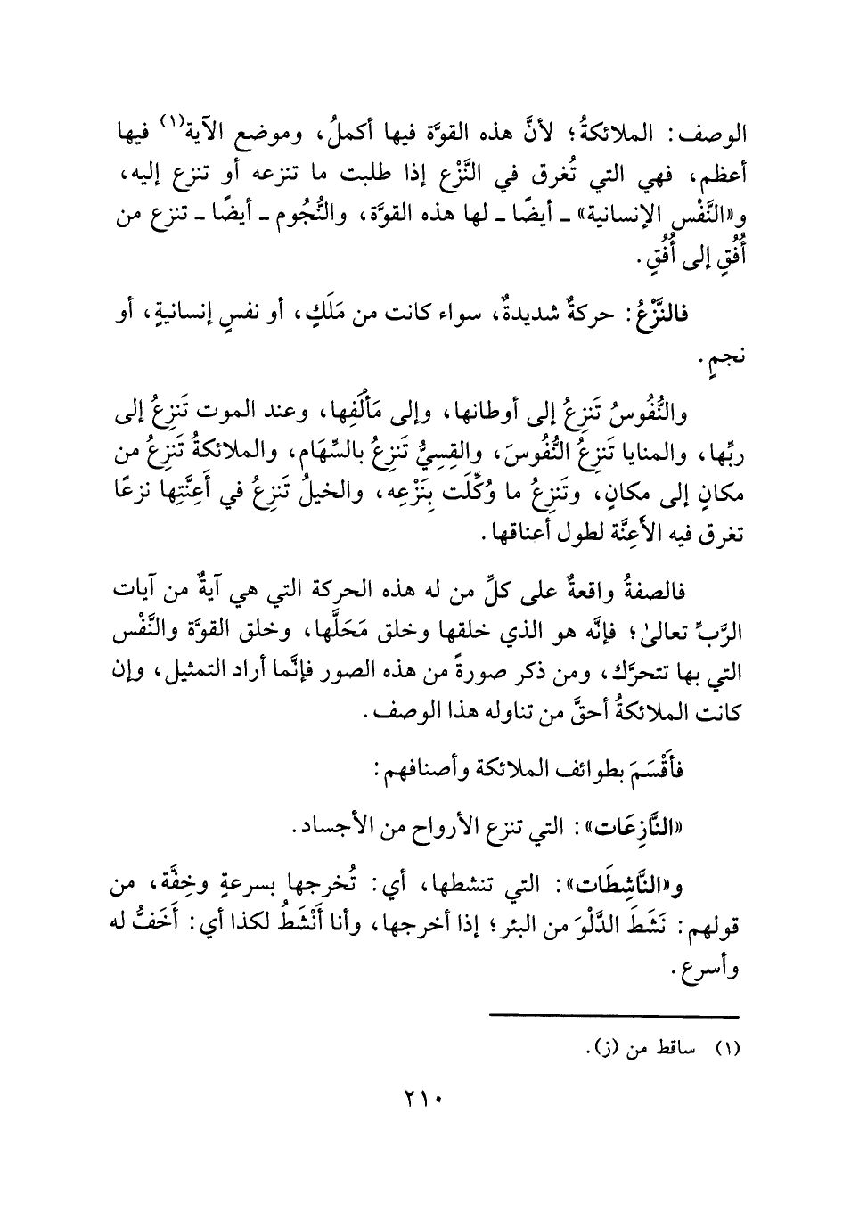 الوصف: الملائكةُ؛ لأنَّ هذه القوَّة فيها أكملُ، وموضع الآية (¬١) فيها أعظم، فهي التي تُغرق في النَّزْع إذا طلبت ما تنزعه أو تنزع إليه، و"النَّفْس الإنسانية" - أيضًا - لها هذه القوَّة، والنُّجُوم - أيضًا - تنزع من أُفُقٍ إلى أُفُقٍ.