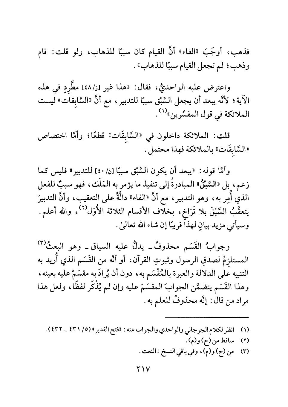 وأمَّا قوله: "يبعد أن يكون السَّبْق سببًا للتدبير" فليس كما زعم، بل "السَّبْقُ" المبادرةُ إلى تنفيذ ما يؤمر به المَلَك، فهو سببٌ للفعل الذي أُمِر به، وهو التدبير، مع أنَّ "الفاء" دالَّةٌ على التعقيب، وأنَّ التدبيرَ يتعقَّبُ السَّبْقَ بلا تَرَاخٍ، بخلاف الأقسام الثلاثة الأُوَل (¬٢)، والله أعلم. وسيأتي مزيد بيانٍ لهذا قريبًا إن شاء الله تعالى.