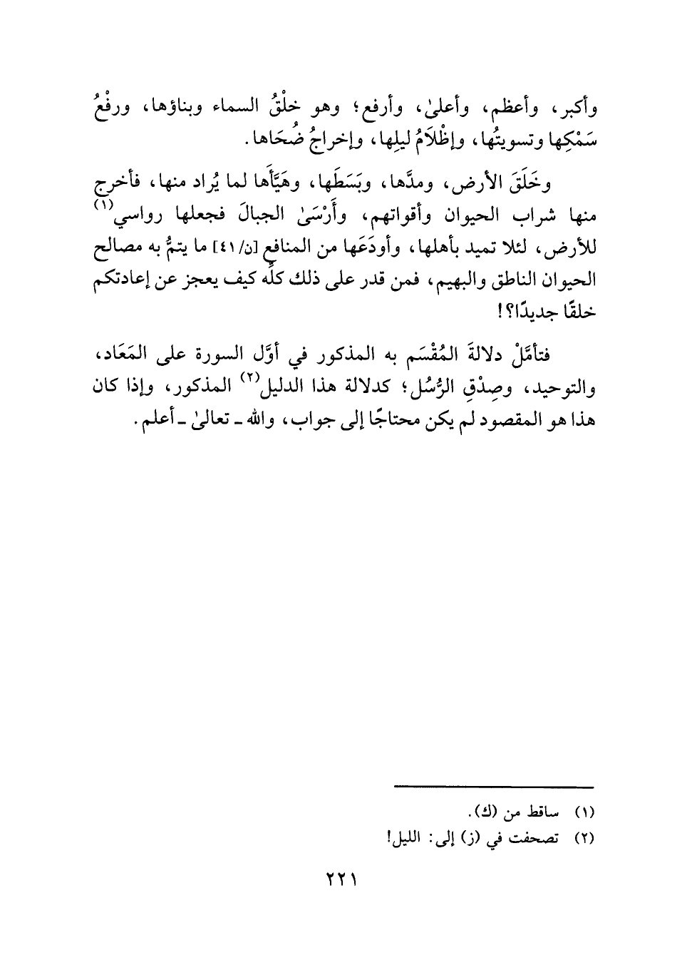 وخَلَقَ الأرض، ومدَّها، وبَسَطَها، وهَيَّأَها لما يُراد منها، فأخرج منها شراب الحيوان وأقواتهم، وأَرْسَى الجبالَ فجعلها رواسي (¬١) للأرض، لئلا تميد بأهلها، وأودَعَها من المنافعِ ما يتمُّ به مصالح الحيوان الناطق والبهيم، فمن قدر على ذلك كله كيف يعجز عن إعادتكم خلقًا جديدًا؟!