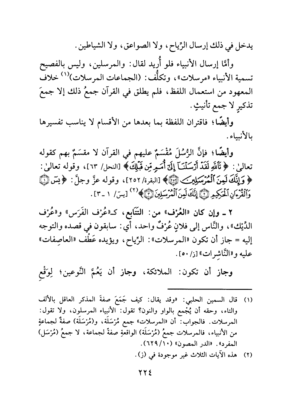 وأمَّا إرسال الأنبياء فلو أُريد لقال: والمرسلين، وليس بالفصيح تسمية الأنبياء "مرسلات"، وتكلُّف: (الجماعات المرسلات) (¬١) خلاف المعهود من استعمال اللفظ، فلم يطلق في القرآن جمعُ ذلك إلا جمعَ تذكيرٍ لا جمع تأنيثٍ.