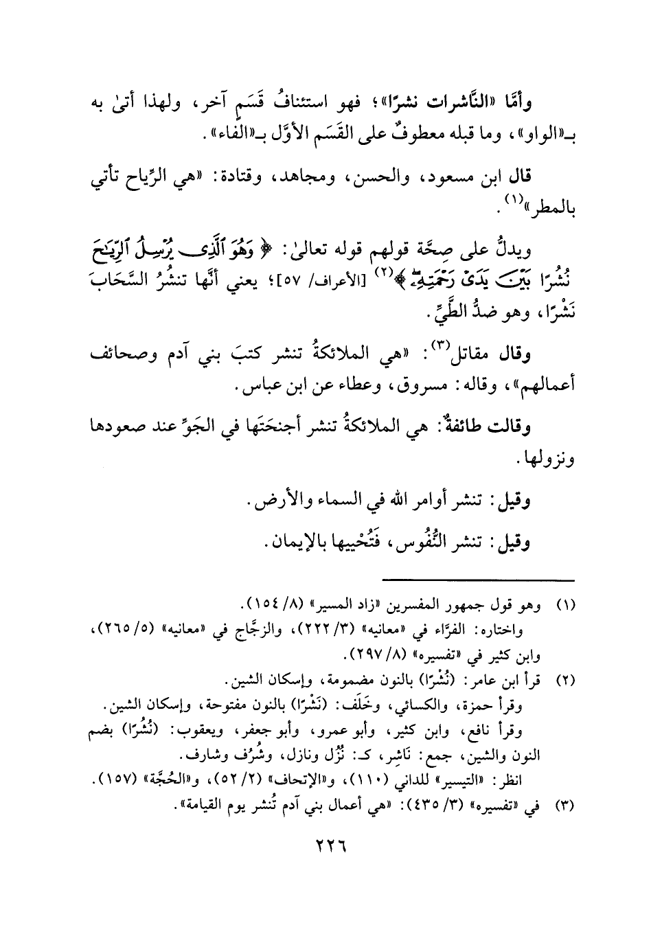 ويدلُّ على صِحَّة قولهم قوله تعالى: {وَهُوَ الَّذِي يُرْسِلُ الرِّيَاحَ بُشْرًا بَيْنَ يَدَيْ رَحْمَتِهِ} (¬٢) [الأعراف: ٥٧]؛ يعني أنَّها تنشُرُ السَّحَابَ نَشْرًا، وهو ضدُّ الطَّيِّ.