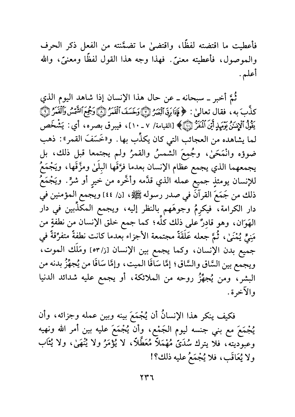 ثُمَّ أخبر - سبحانه - عن حال هذا الإنسان إذا شاهد اليوم الذي كذَّبَ به، فقال تعالى: {فَإِذَا بَرِقَ الْبَصَرُ (٧) وَخَسَفَ الْقَمَرُ (٨) وَجُمِعَ الشَّمْسُ وَالْقَمَرُ (٩) يَقُولُ الْإِنْسَانُ يَوْمَئِذٍ أَيْنَ الْمَفَرُّ (١٠)} [القيامة: ٧ - ١٠]، فيبرق بصره، أي: يَشْخَص لما يشاهده من العجائب التي كان يكذِّب بها. و"خَسَفَ القمر": ذهب ضوؤه وانْمَحَى، وجُمِعَ الشمسُ والقمرُ ولم يجتمعا قبل ذلك، بل يجمعهما الذي يجمع عظام الإنسان بعدما فرَّقَها البِلَى ومزَّقَها، ويَجْمَعُ للإنسان يومئذٍ جميع عمله الذي قدَّمه وأخَّره من خَيرٍ أو شرٍّ. ويَجْمَعُ ذلك من جَمَعَ القرآنَ في صدر رسوله - صلى الله عليه وسلم -، ويجمع المؤمنين في دار الكرامة، فيكرِمُ وجوهَهم بالنظر إليه، ويجمع المكذِّبين في دار الهَوَان، وهو قادِرٌ على ذلك كلِّه؛ كما جمع خلق الإنسان من نطفةٍ من مَنِيٍّ يُمْنَى، ثُمَّ جعله عَلَقَةً مجتمعة الأجزاء بعدما كانت نطفةً متفرِّقةً في جميع بدن الإنسان، وكما يجمع بين الإنسان ومَلَك الموت، ويجمع بين السَّاق والسَّاق؛ إمَّا سَاقَا الميت، وإمَّا سَاقَا من يُجهِّزُ بدنه من البشر، ومن يُجهِّزُ روحه من الملائكة، أو يجمع عليه شدائد الدنيا والآخرة.