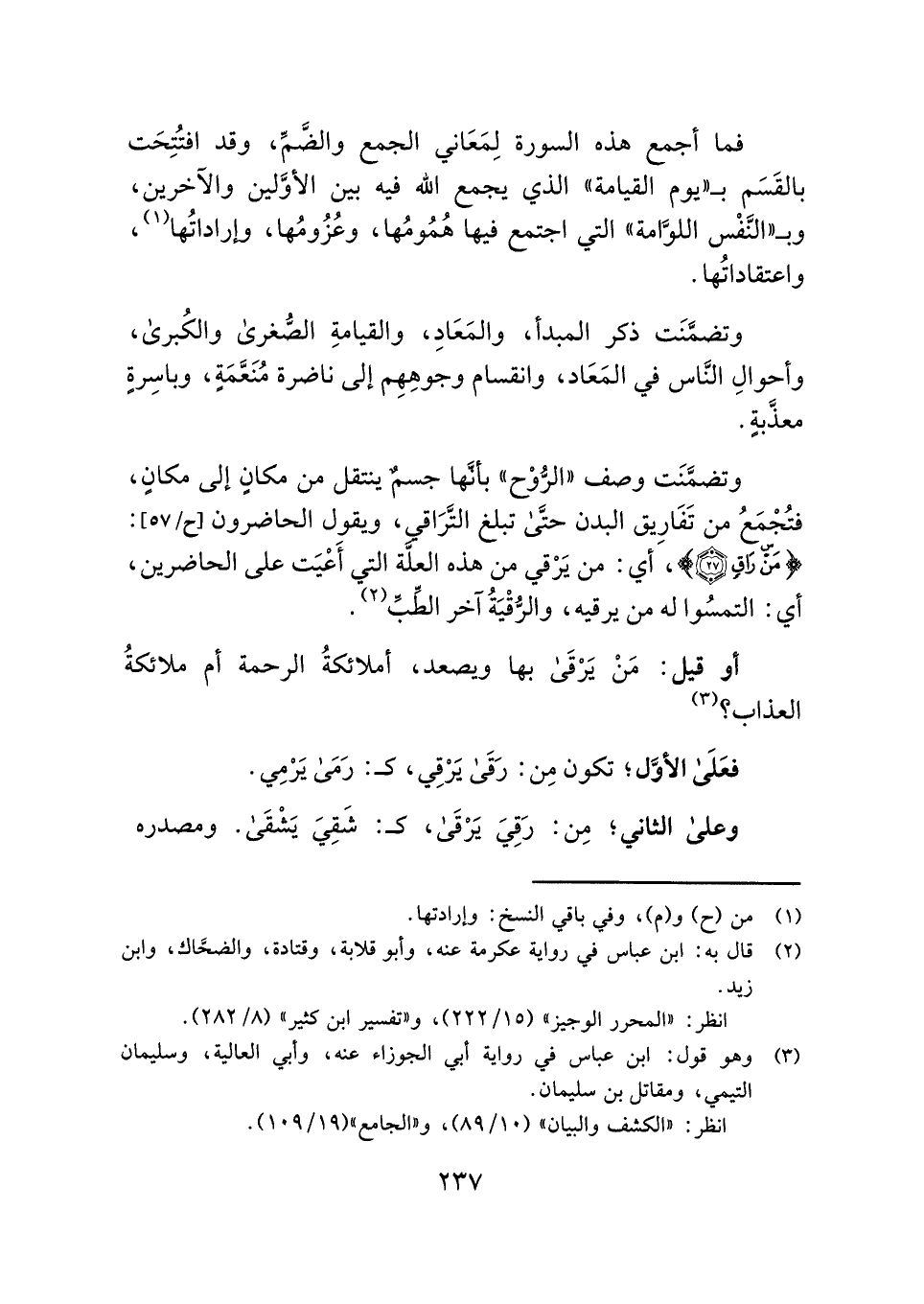 وتضمَّنَت وصف "الرُّوْح" بأنَّها جسمٌ ينتقل من مكانٍ إلى مكانٍ، فتُجْمَعُ من تَفَاريق البدن حتَّى تبلغ التَّرَاقي، ويقول الحاضرون: {مَنْ رَاقٍ (٢٧)} , أي: من يَرْقي من هذه العلَّة التي أَعْيَت على الحاضرين، أي: التمسُوا له من يرقيه، والرُّقْيَةُ آخر الطِّبِّ (¬٢).