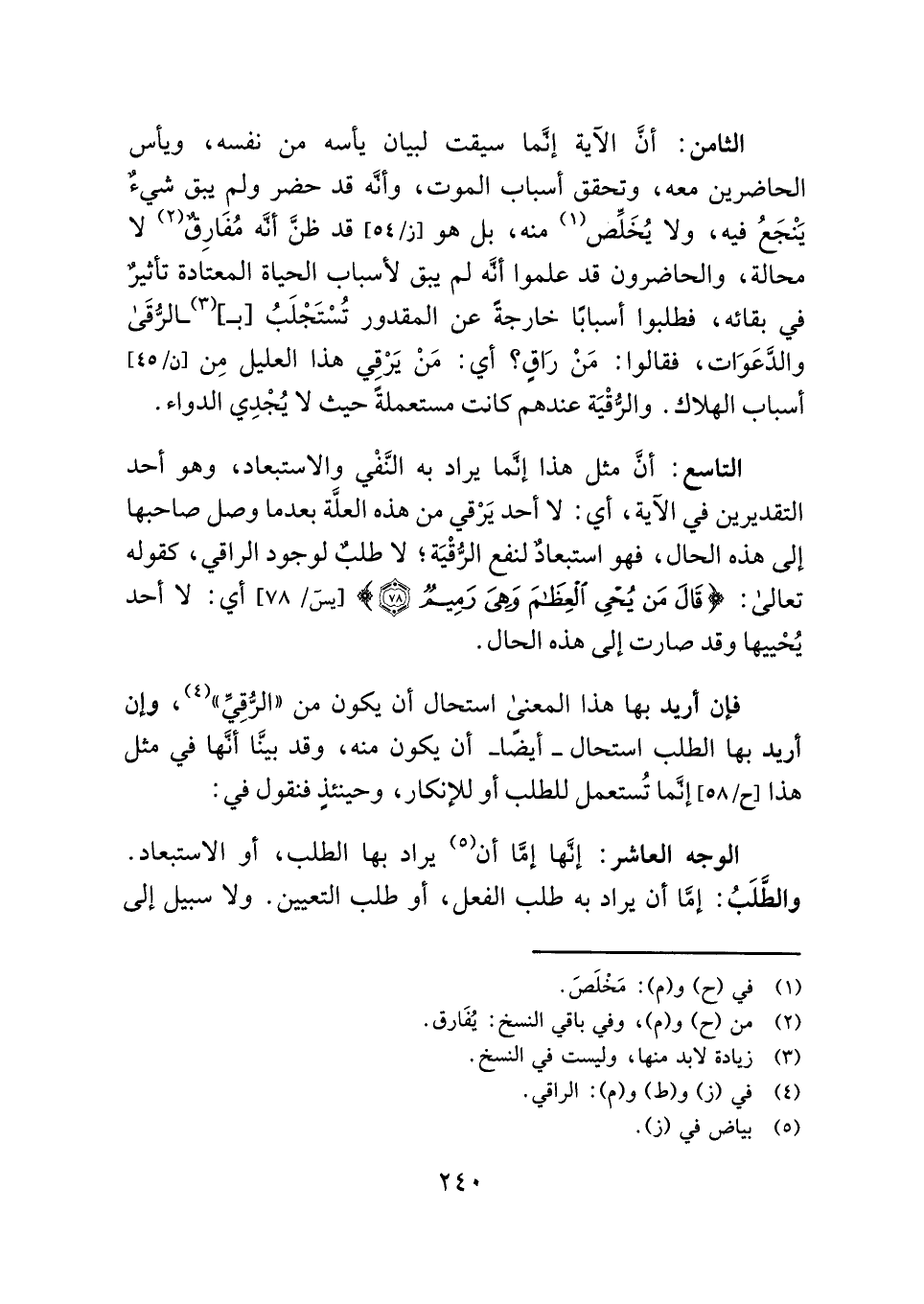التاسع: أنَّ مثل هذا إنَّما يراد به النَّفْي والاستبعاد، وهو أحد التقديرين في الآية، أي: لا أحد يَرْقي من هذه العلَّة بعدما وصل صاحبها إلى هذه الحال، فهو استبعادٌ لنفع الرُّقْيَة؛ لا طلبٌ لوجود الراقي، كقوله تعالى: {قَالَ مَنْ يُحْيِ الْعِظَامَ وَهِيَ رَمِيمٌ (٧٨) } [يس: ٧٨] أي: لا أحد يُحْييها وقد صارت إلى هذه الحال.